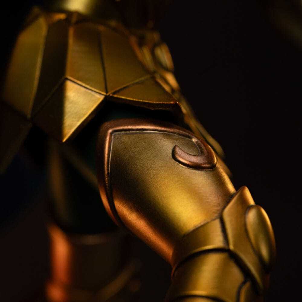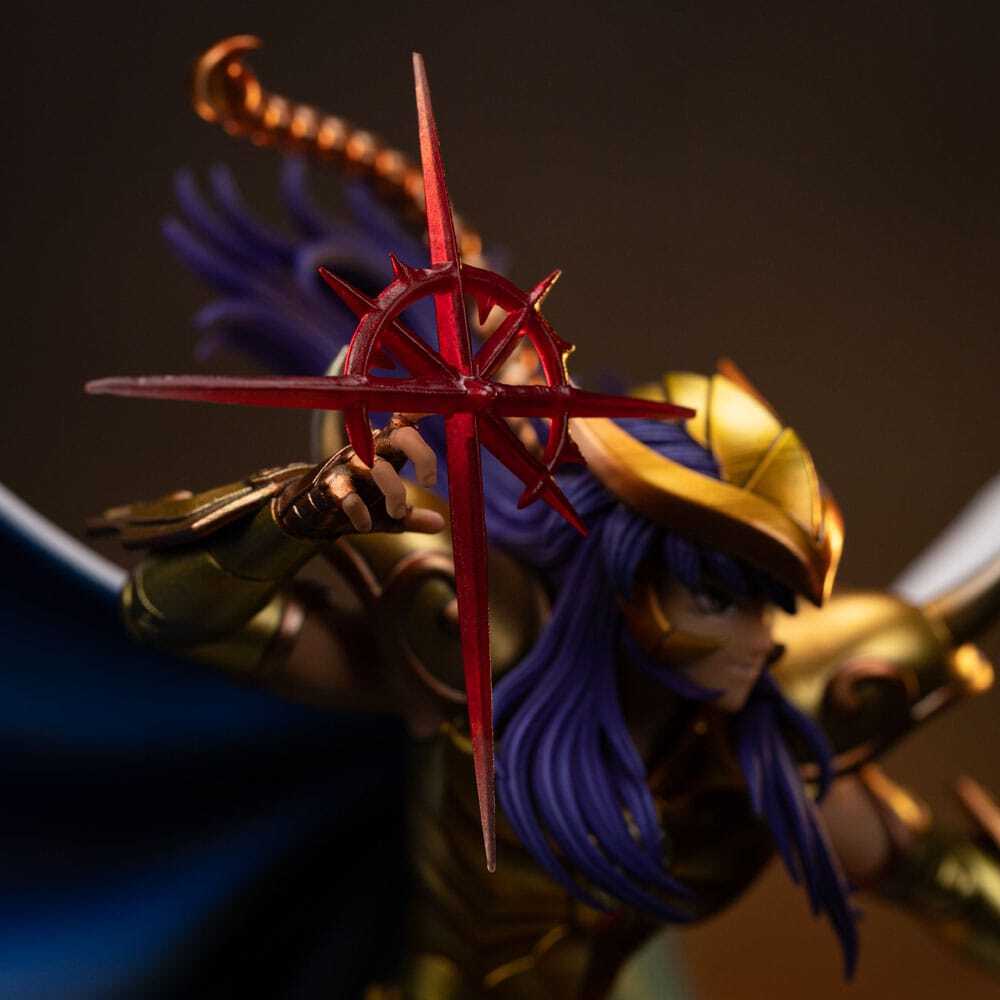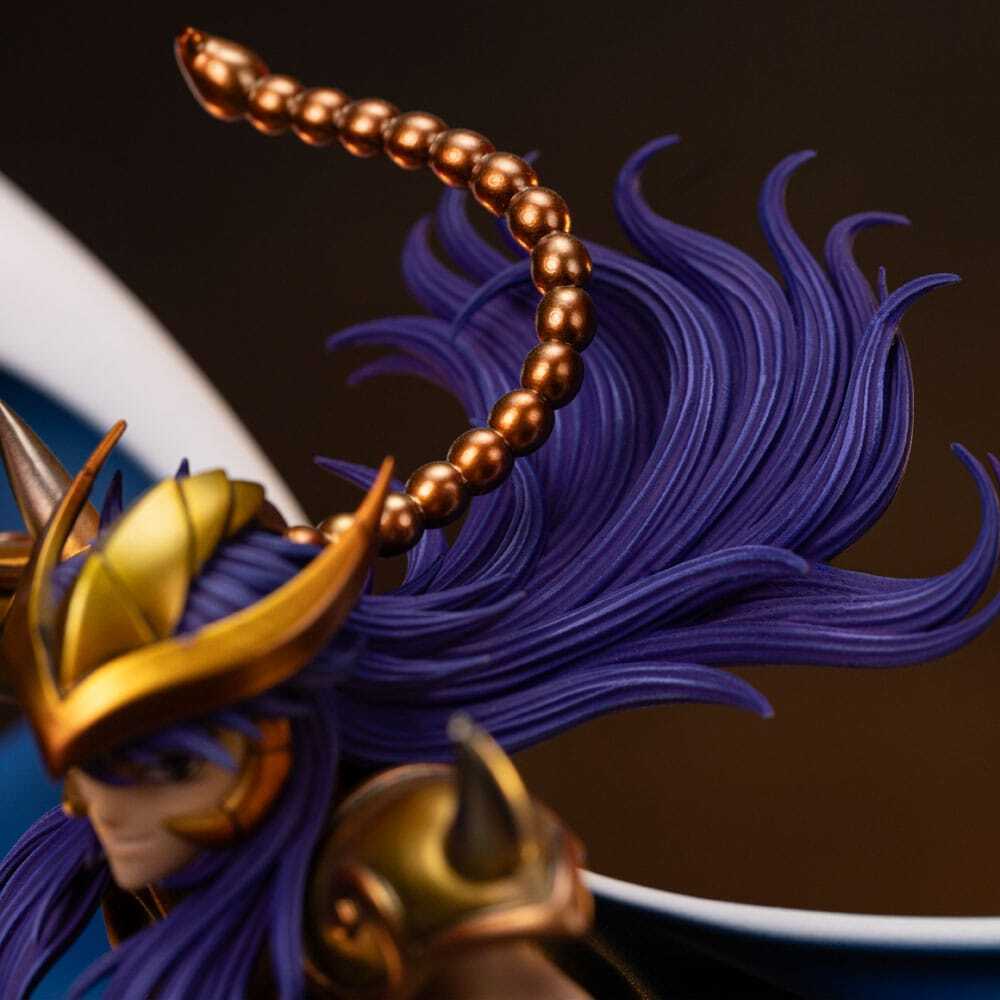 Esta estatua tiene licencia oficial y se producirá en una edición limitada. La base presenta detalles intrincados fieles a las referencias originales de la serie, dando vida al legendario Santo Dorado de Escorpio.