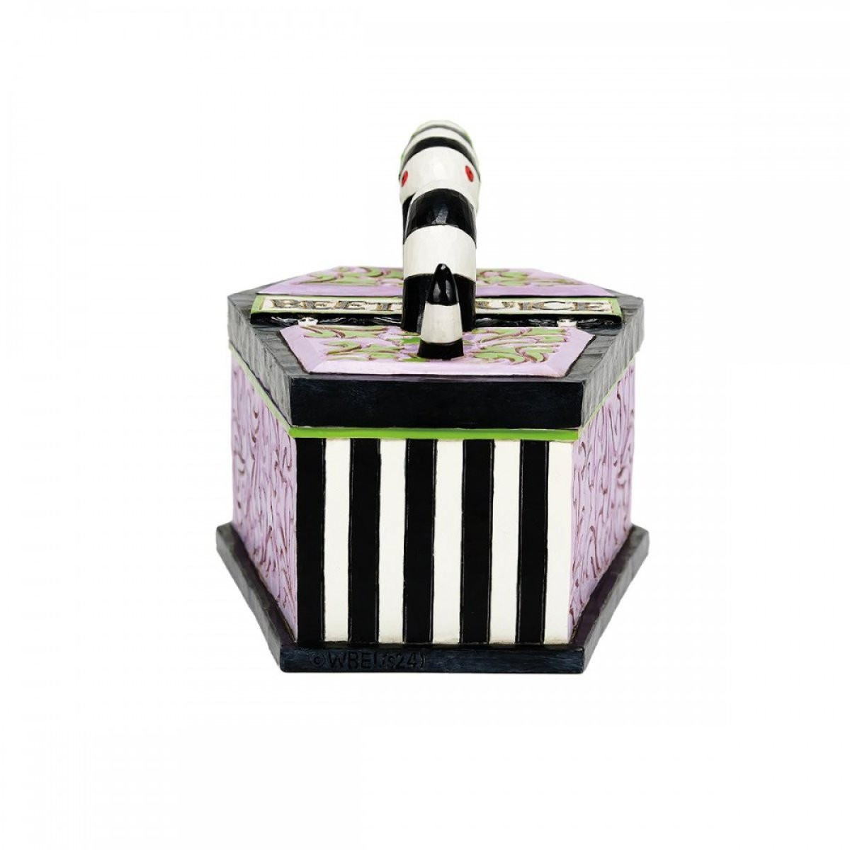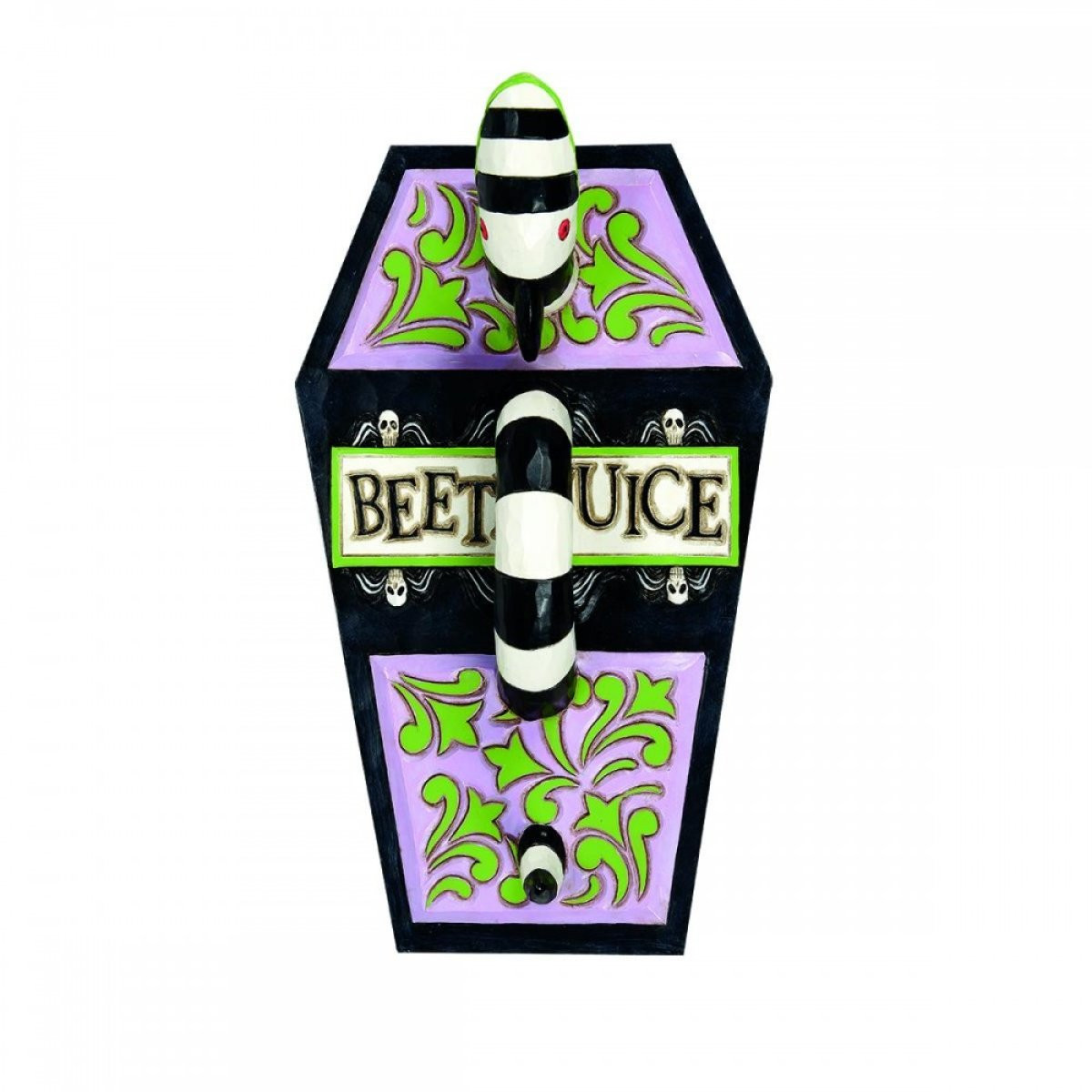 joyas con forma de ataúd, inspirado en Beetlejuice con un gusano de arena encima. Pintado a mano y fabricado en piedra fundida de alta calidad con una inscripción en el interior que hace referencia a la película. Diseñado por el galardonado artista y escultor Jim Shore para la colección Beetlejuice. Estas figuras no son juguetes para niños. Destinado únicamente a adultos.