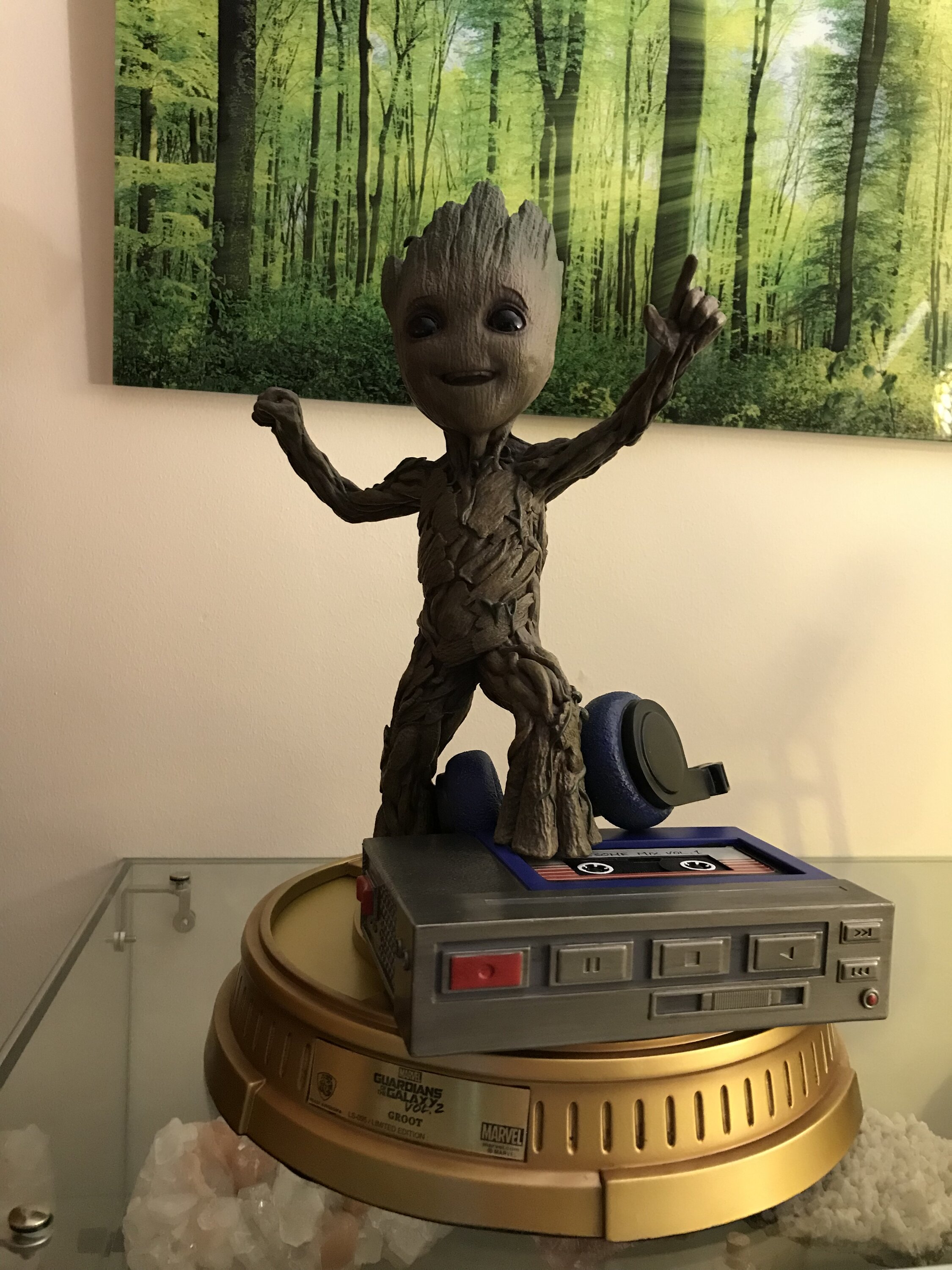 Utilizando las mejores técnicas de escultura y pintura, permite a los coleccionistas admirar cada detalle, por pequeño que sea, en tamaño real. Además de las texturas de las ramas de Groot y el reproductor de casetes de la vieja escuela, se prestó especial atención al rostro adorable y expresivo de Groot y a su dinámica pose de bailarín. Esto captura su actitud animada de “fiebre del sábado por la noche” y su sonrisa contagiosa. ¡No olvides admirar los auriculares a sus pies, listos para reproducir las canciones una tras otra!