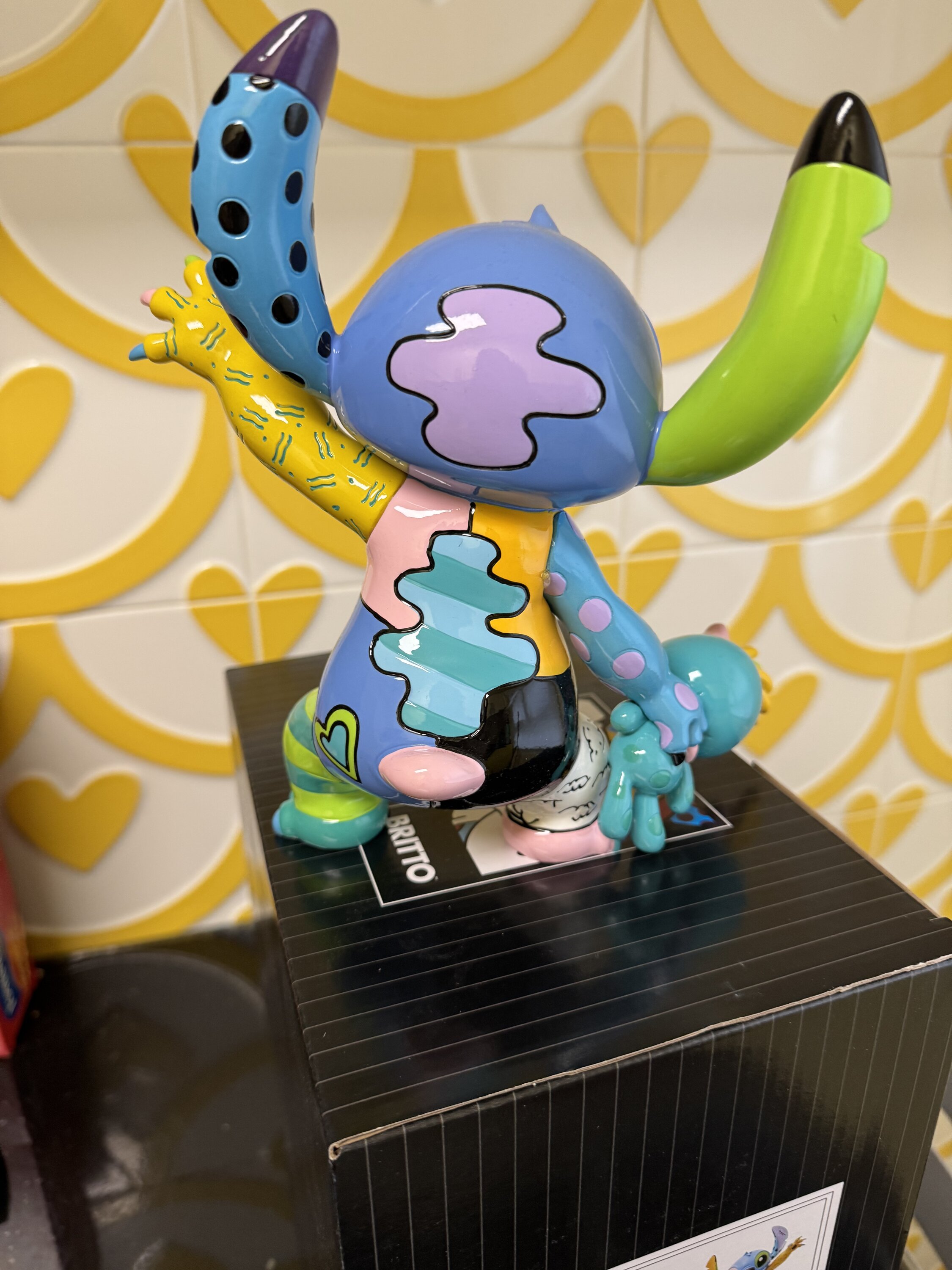 Stitch, el amigable alienígena de Disney, recibió el tratamiento de Romero Britto en esta llamativa figura, que se lanzará en 2024. Sosteniendo el confiable muñeco de trapo Scrump de Lilo en una mano y saludando con la otra, esta figura pintada a mano y de colores brillantes se vería Genial como pieza de exhibición en cualquier hogar. El uso que hace Britto del color y el patrón es inconfundible, con patrones y paletas que chocan entre sí, lo que hace de esta pieza una pieza de colección verdaderamente única. Esto no es un juguete ni un producto para niños. Destinado únicamente a adultos.