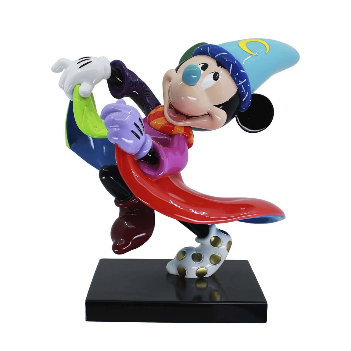 El artista pop Romero Britto celebra el 85 aniversario de la obra maestra animada Fantasía de Walt Disney con este Mickey brujo de El aprendiz de brujo. Cada escultura está pintada a mano por hábiles artesanos en la vibrante paleta de colores pop de Britto.