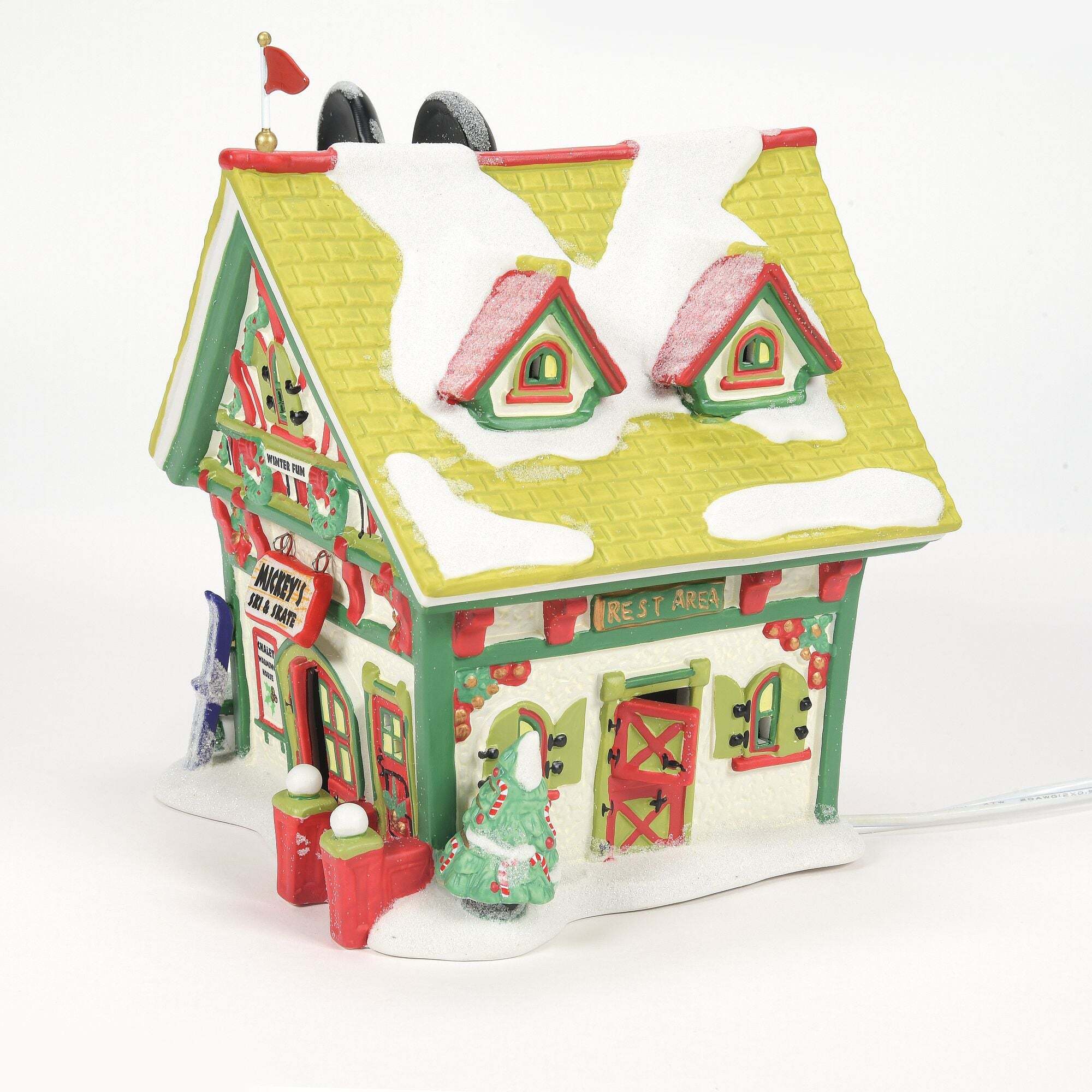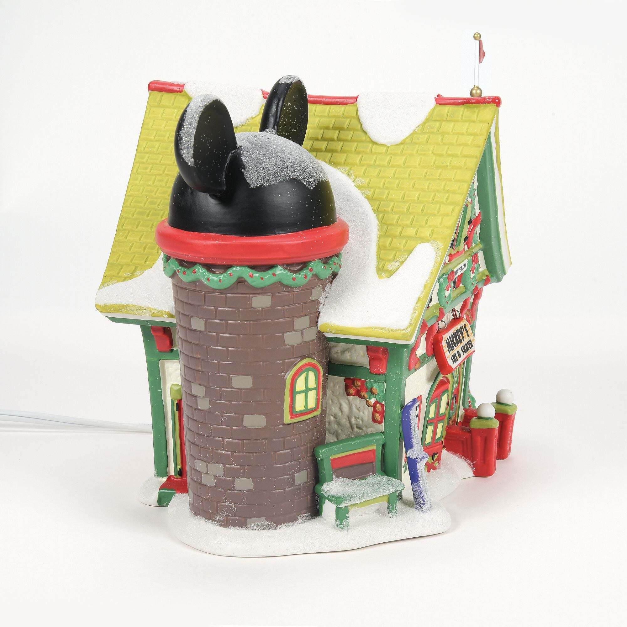 La Aldea de Mickey cobra vida con el universo Navidad . Cada pieza iluminada incluye un cable con interruptor y una bombilla, y fue diseñada por los artistas de Department 56.