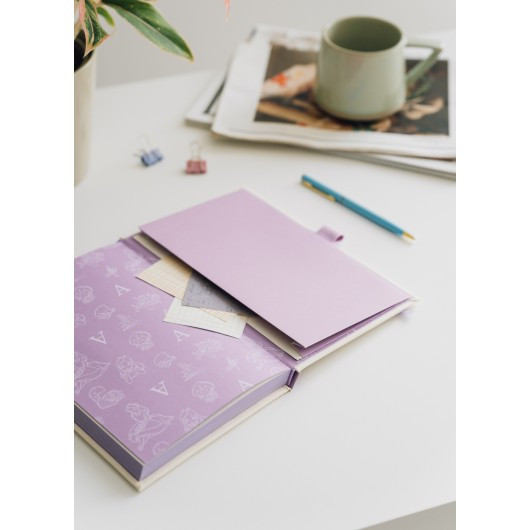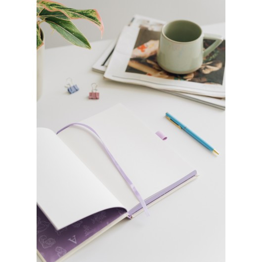 Cuaderno A5 de tapa dura con bolígrafo. Presenta una cubierta laminada mate con efecto acolchado y tacto suave, páginas en blanco, esquinas cuadradas, encuadernación pegada, bolsillo y marcapáginas con cinta. Contiene 96 hojas (192 páginas) de 100 g/m2
