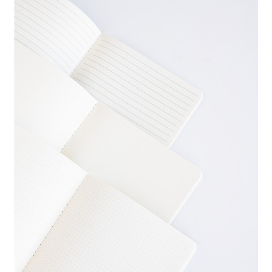 Set de 3 libretas A5 de tapa blanda, con tres diseños diferentes. Cada cuaderno mide 14,8 x 21 cm y está fabricado con una cubierta de papel impreso de 300 g/m². Cada cuaderno tiene 32 hojas de 80 g/m² (64 páginas) y contiene un tipo de interior diferente: rayado, punteado, blanco.