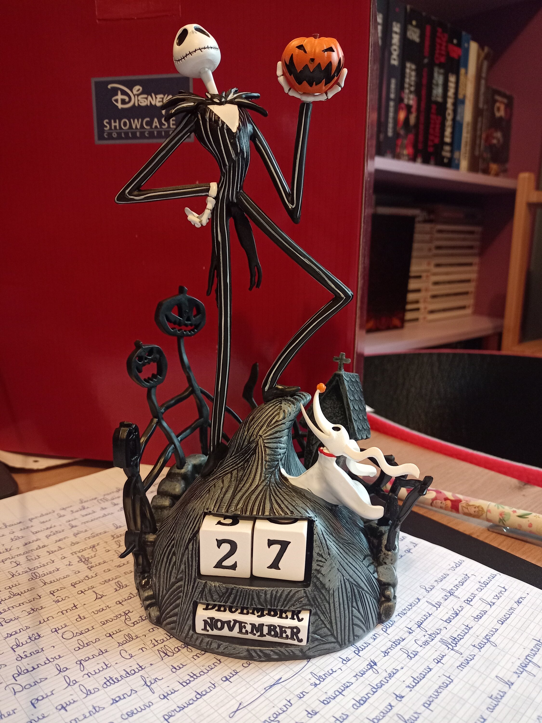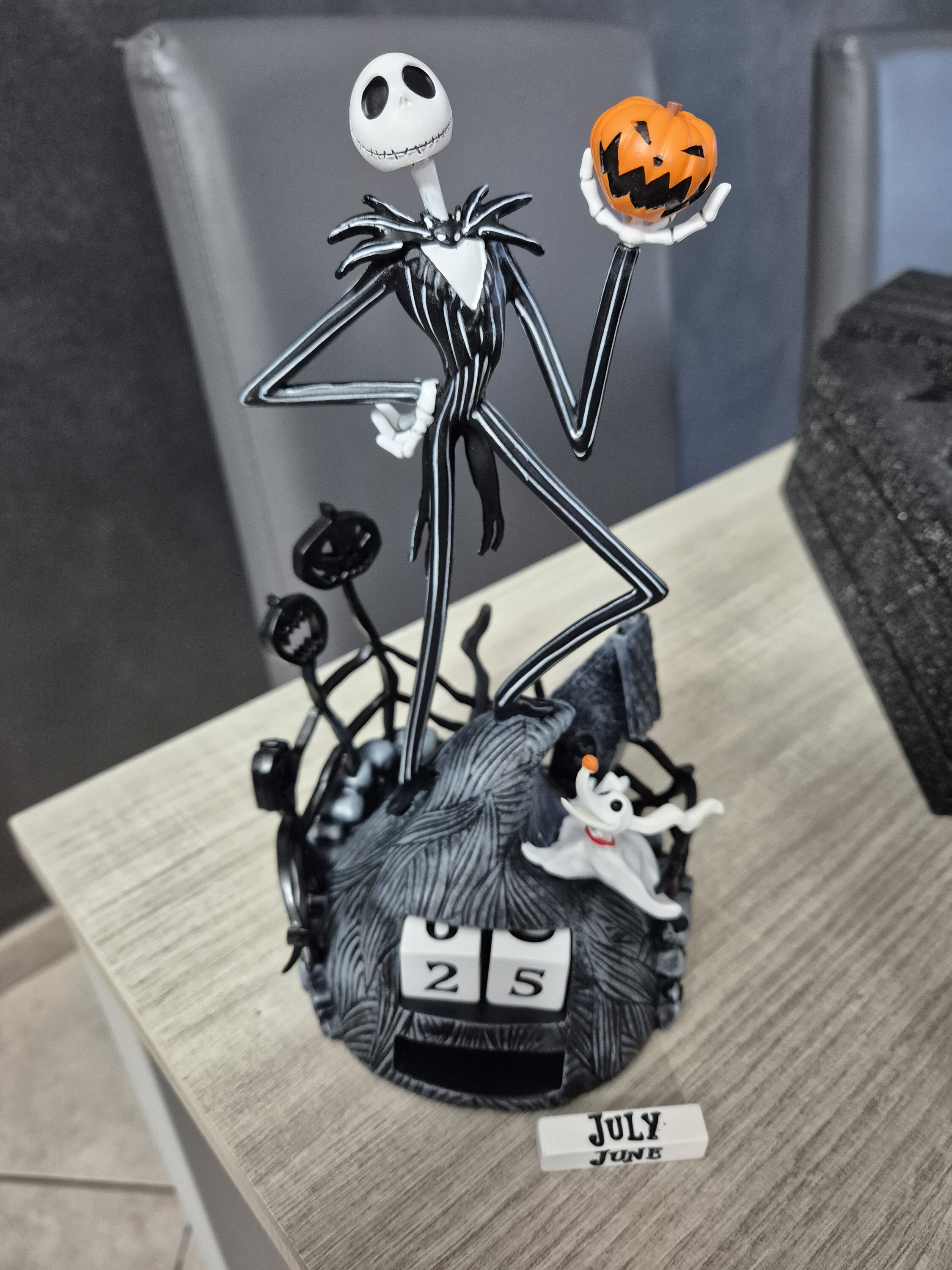 Calendario perpetuo 3D, fabricado en resina y pintado a mano. Está compuesto por 2 partes móviles, la calabaza y la cabeza de Jack Skellington, siendo estas dos partes reemplazables entre sí para poder personalizar la figura. Incluye 5 bloques con días y meses que se pueden intercambiar y combinar para obtener todo las fechas posibles.