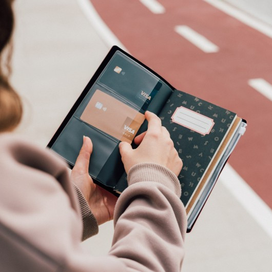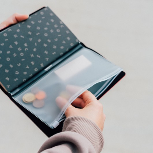 Cuaderno de viaje con cubierta suave de poliuretano. Incluye espacio para tarjetas, dos cuadernos reemplazables de 80 hojas (160 páginas) con dos tipos de página (punteada y rayada) y un bolsillo en el extremo. Tiene una banda elástica y un cierre de poliuretano.