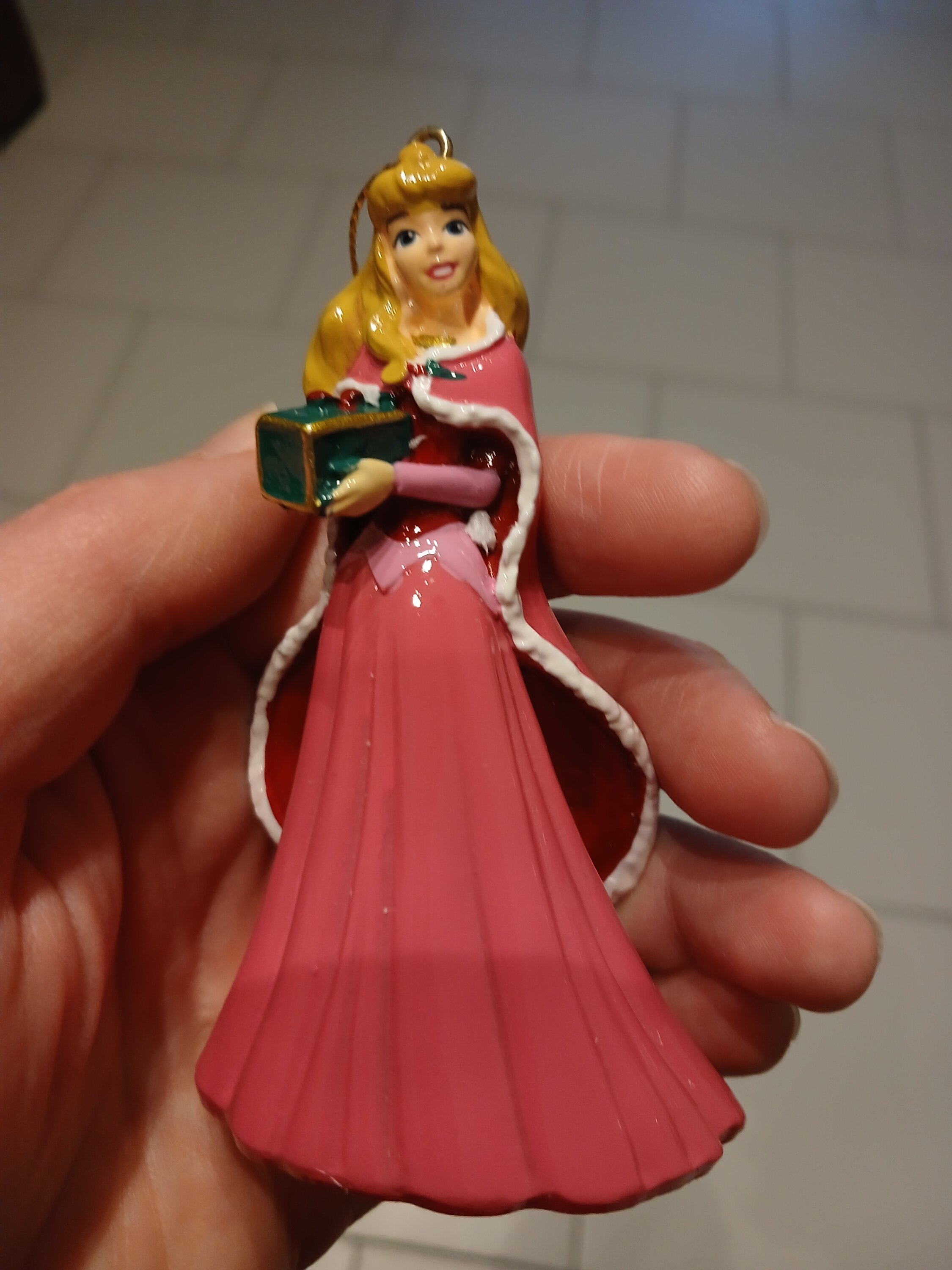 Aurora, con su paquete envuelto para regalo, es muy bonita para decorar el árbol de Navidad.