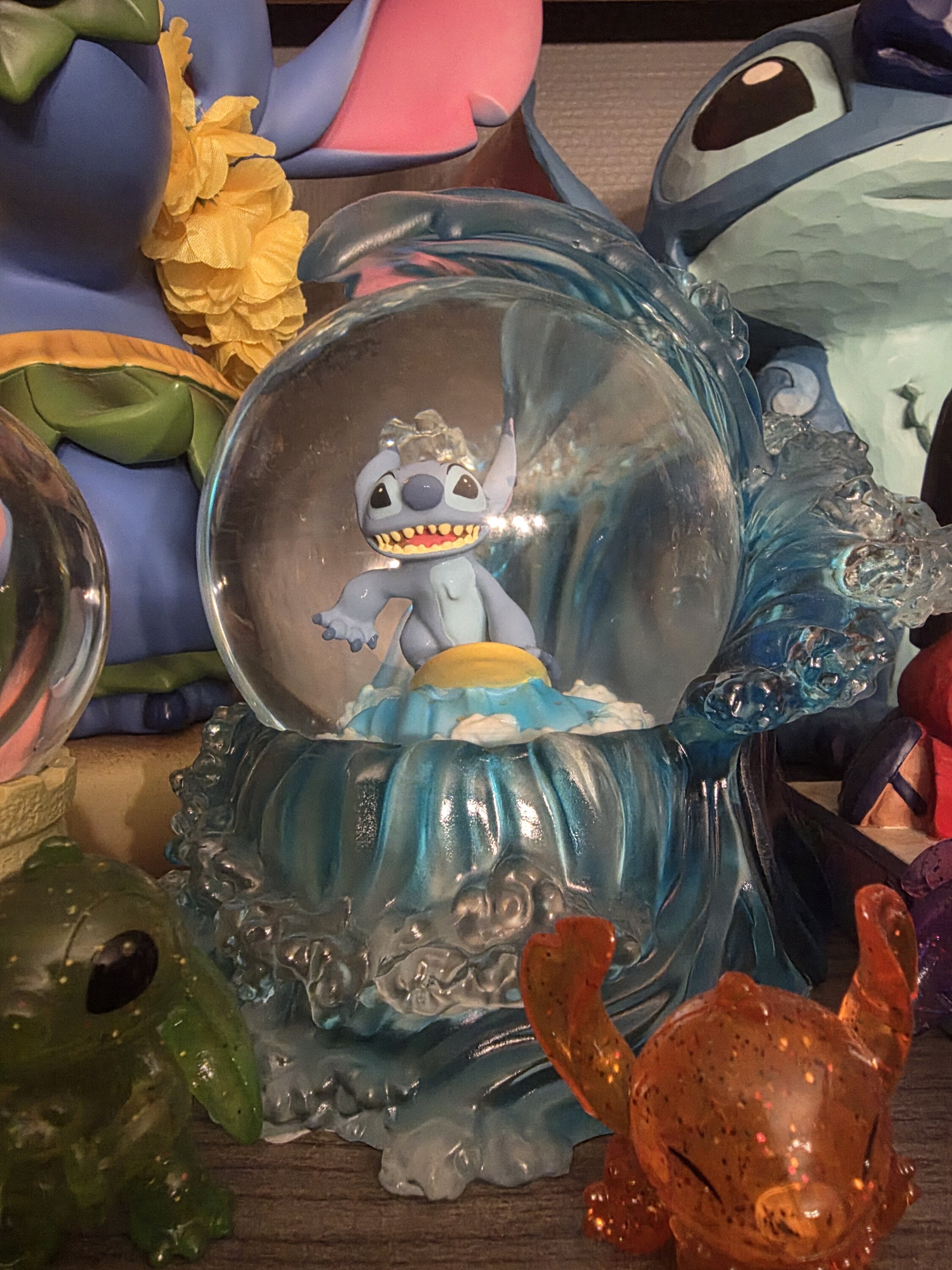 Stitch se vuelve agresivo y hace un chapoteo tubular en esta bola de agua de resina bellamente esculpida. Completamente encerrado en una onda de resina transparente, ¿ la stitch colgará diez o será una aniquilación total?