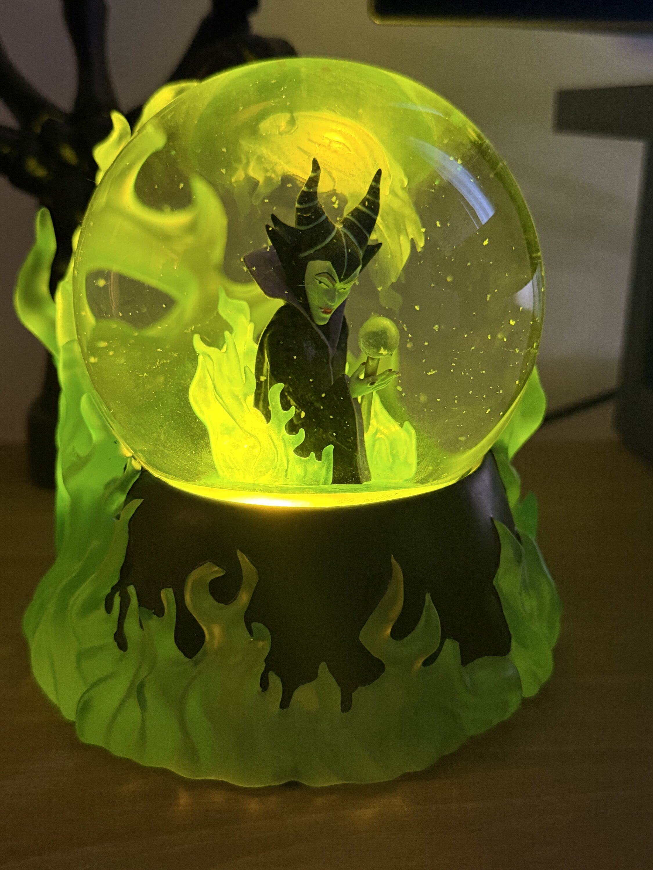 Como si fuera un hechizo ante tus propios ojos, esta bola de agua de Maléfica ilumina las llamas translúcidas de color verde brillante que rodean a Maléfica por dentro y por fuera de esta bola de agua de 100 mm.