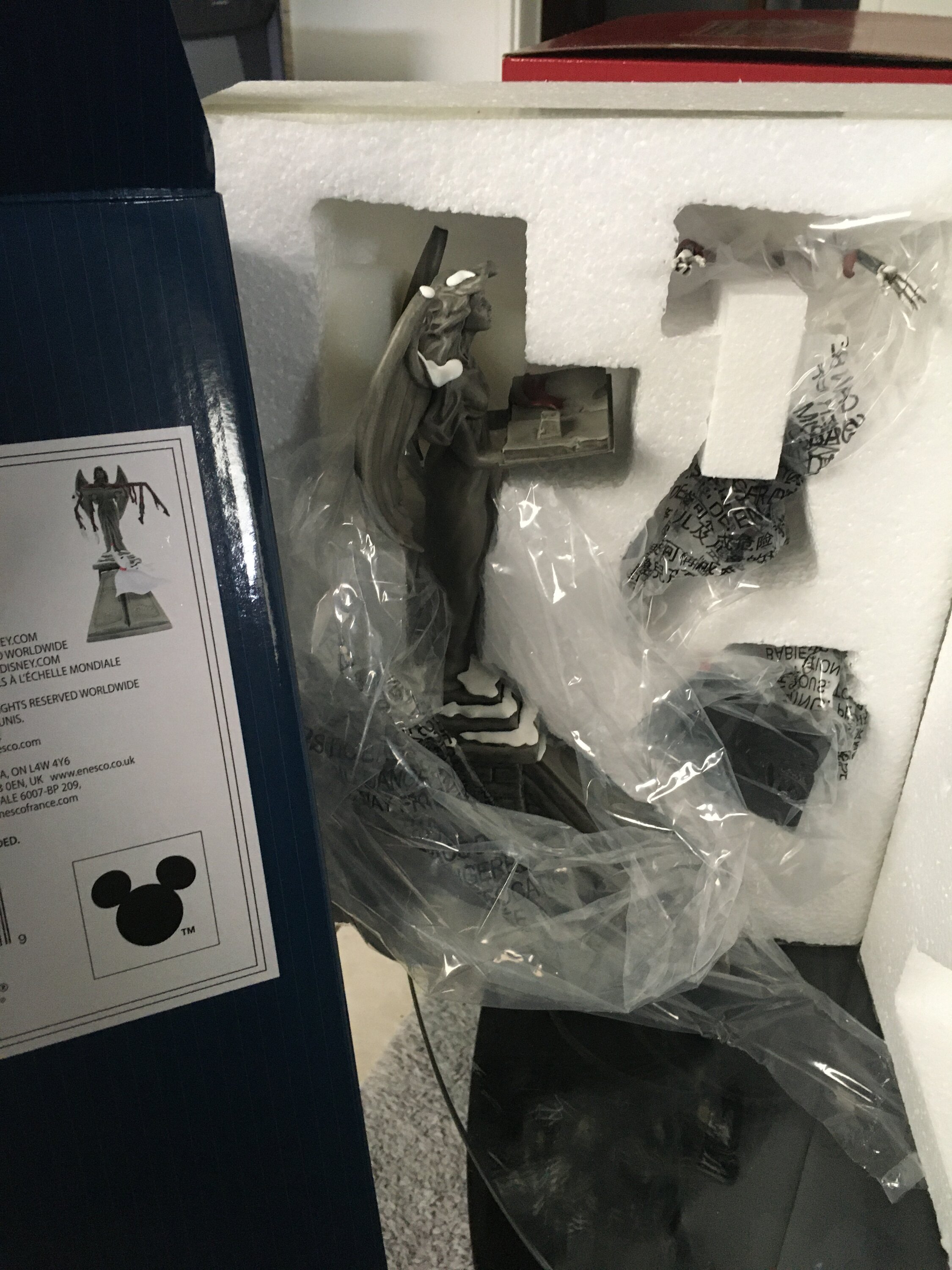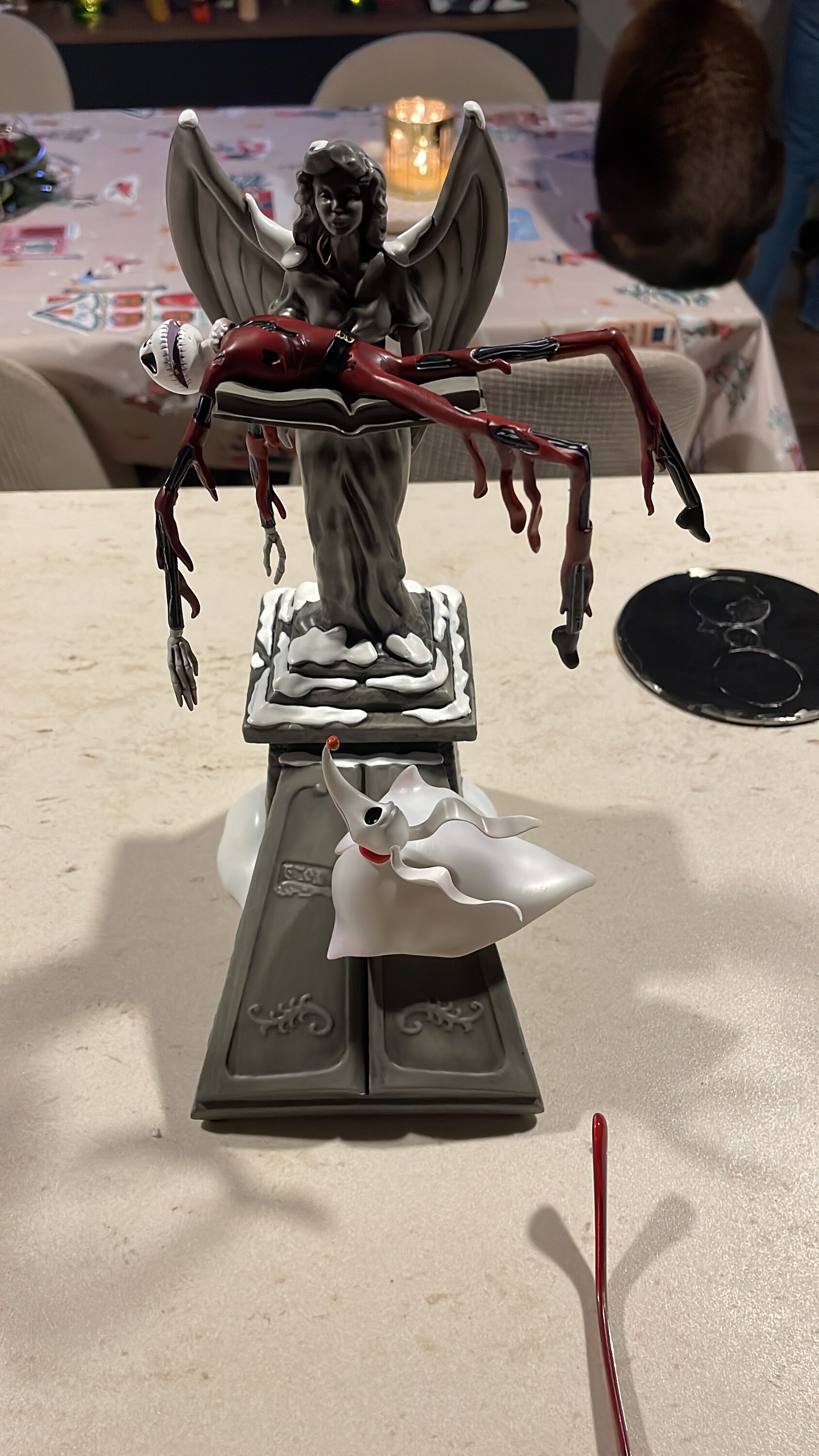 Un Cero iluminado mira a su maestro derrotado Jack Skellington mientras cae del cielo en los brazos de un ángel sobre una lápida. Una nueva estatua de Tim Burton, muy detallada y hecha a mano, que celebra la película favorita de los fans, Pesadilla antes de Navidad.