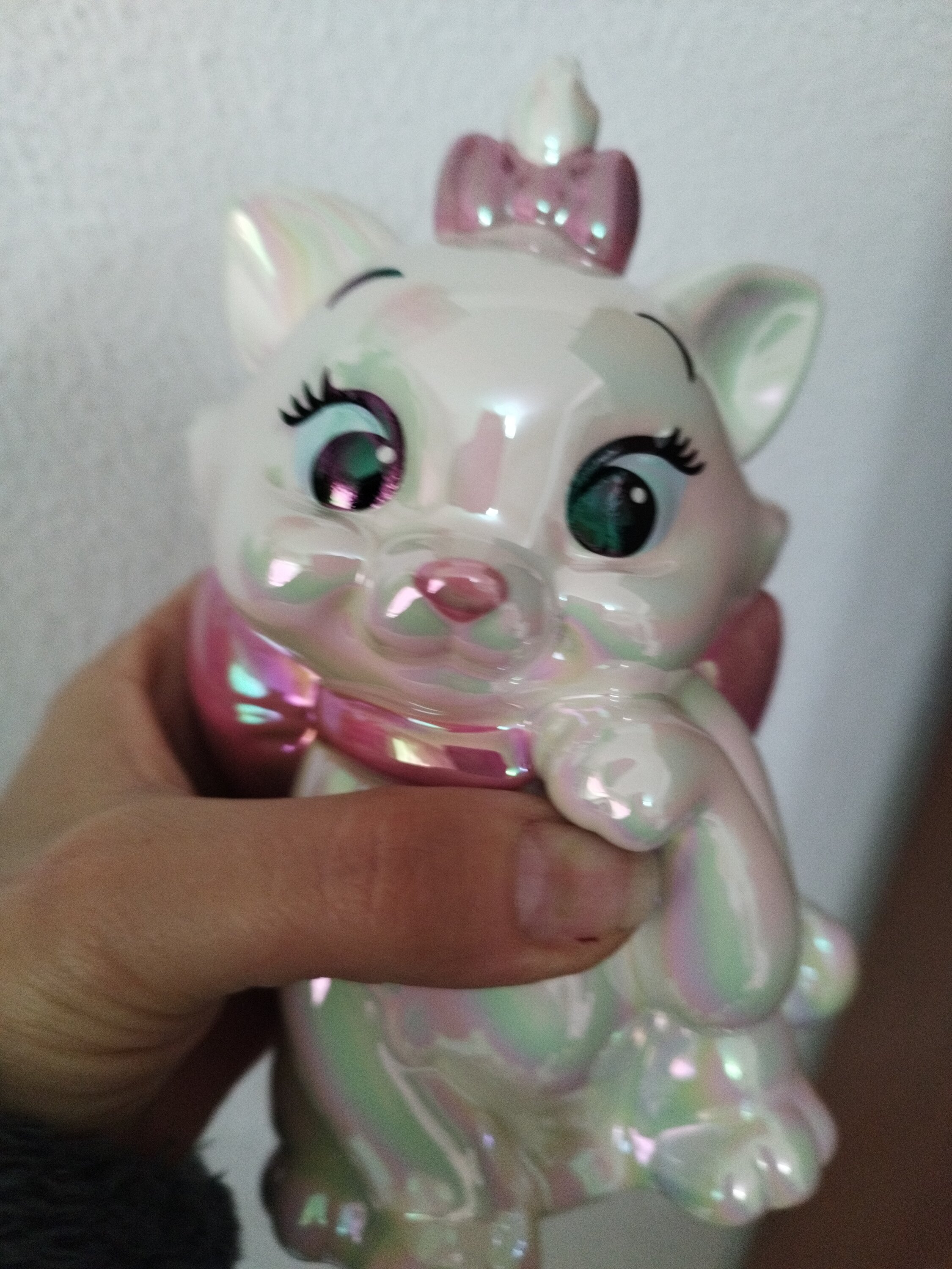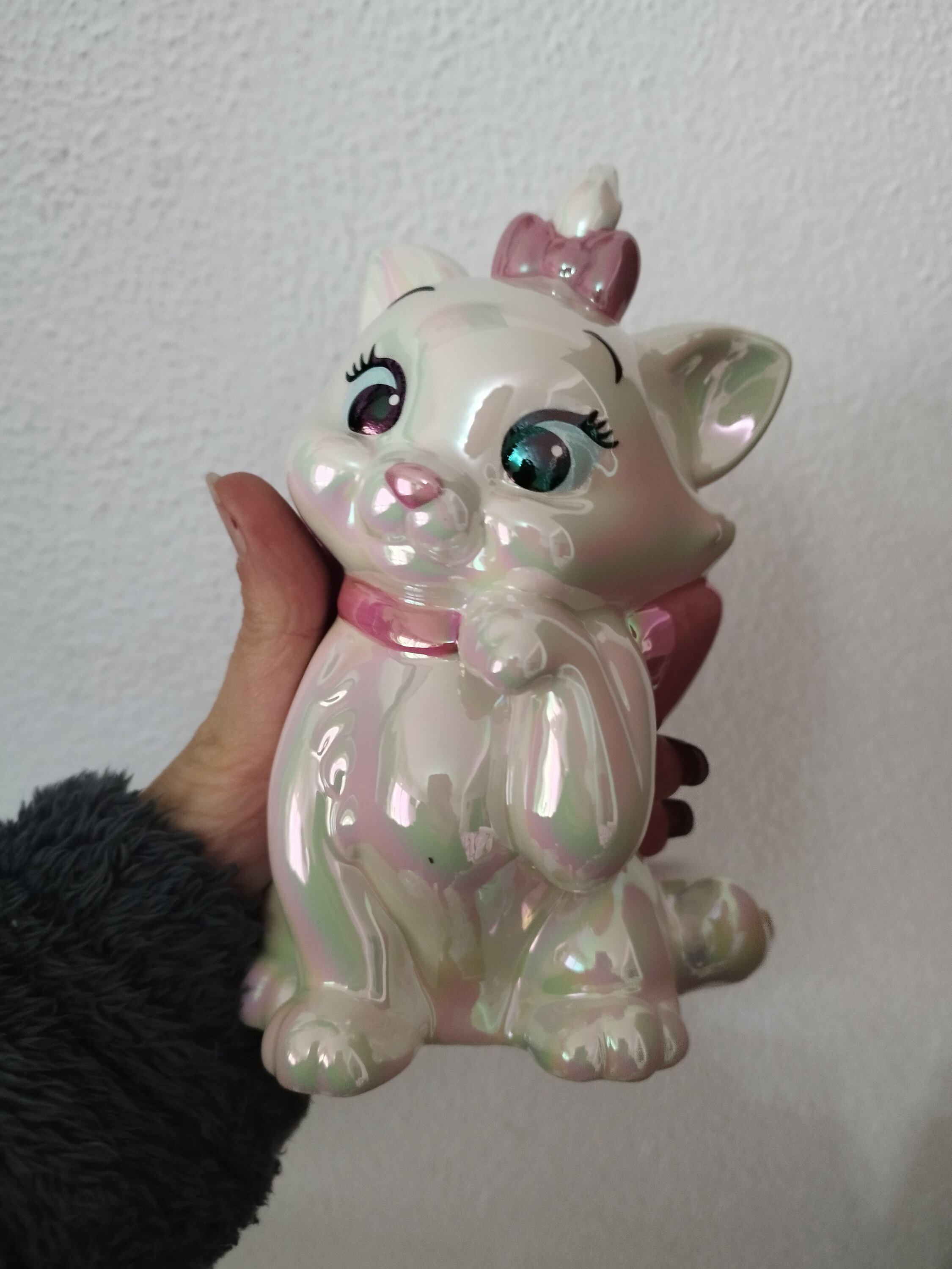 Marie, la adorable gatita del clásico animado de Disney Los Aristogatos, aparece en esta hucha de cerámica moldeada y pintada a mano. Un proceso especial de galvanoplastia le da a Marie un brillo iridiscente único y muy atractivo.