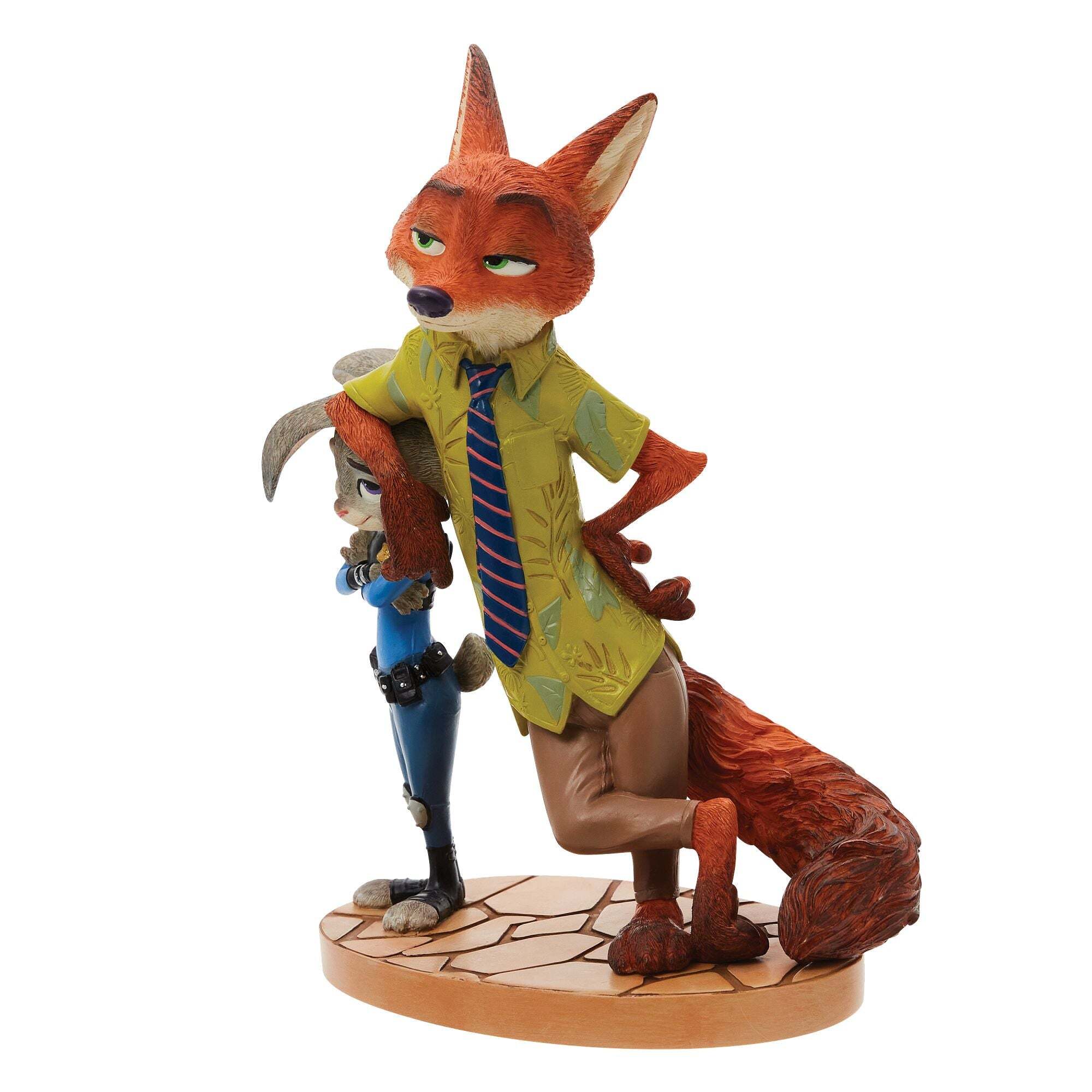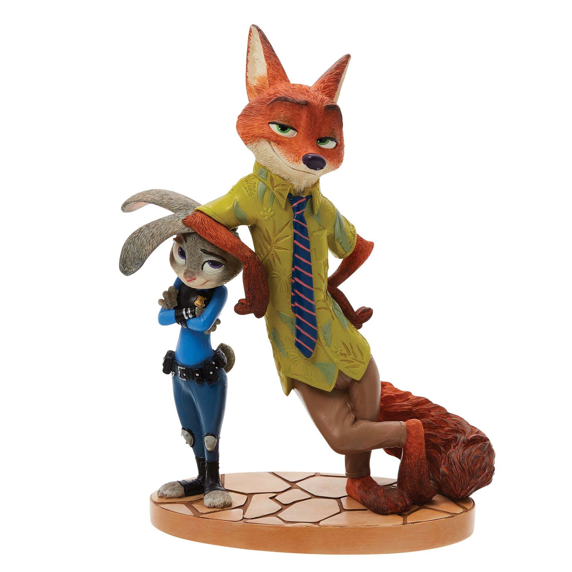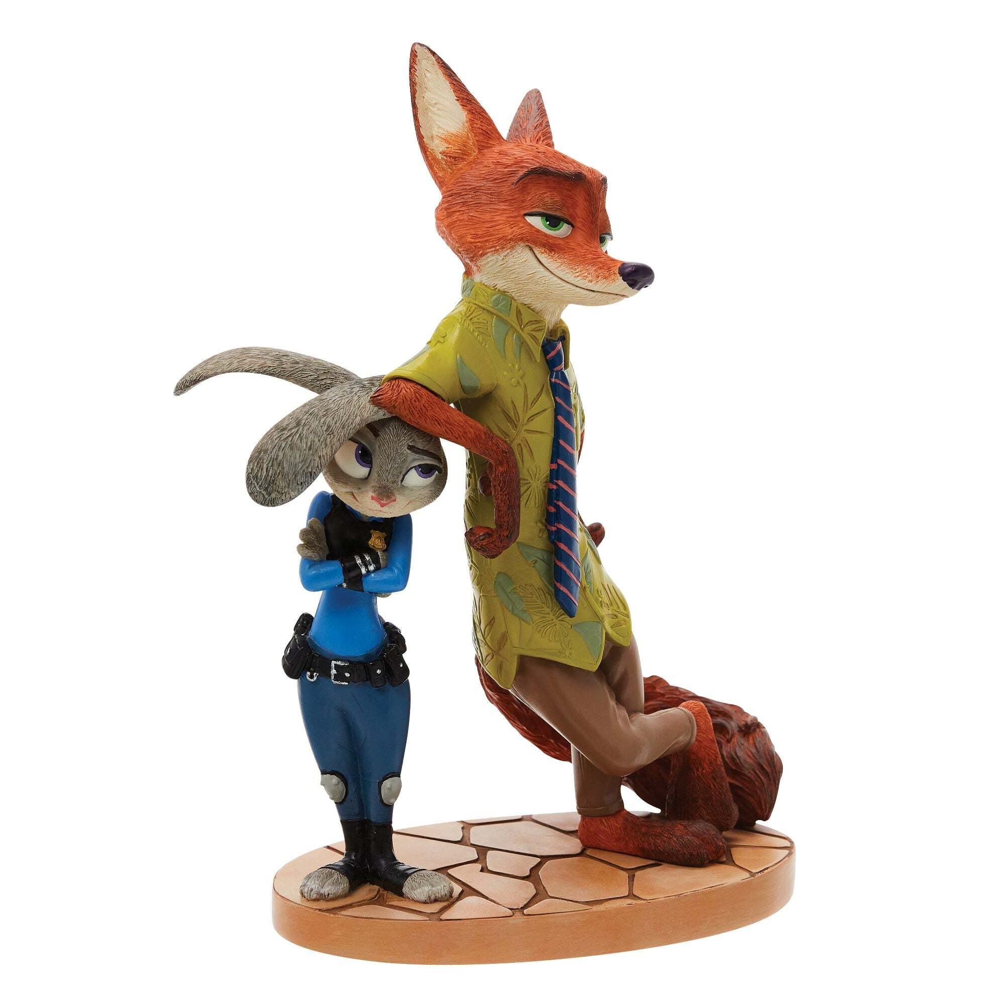 Celebra la icónica colaboración de Zootopia de Disney con esta figura de Nick Wilde y Judy Hopps, de la Colección Disney Showcase , bellamente elaborada. Nick, el astuto y carismático zorro, adopta su característica pose relajada mientras se apoya con naturalidad en Judy Hopps, la conejita policía decidida, que se mantiene de pie con los brazos cruzados con seguridad. La figura captura a la perfección la dinámica juguetona y la amistad entre los dos queridos personajes. Esculpida y pintada a mano por expertos, esta pieza de colección resalta las detalladas texturas de su pelaje, sus expresivos rostros y sus atuendos reconocibles al instante: la camisa verde estampada y la corbata a rayas de Nick, y el uniforme azul de policía de Judy. Los personajes se encuentran sobre una base decorativa inspirada en las calles de Zootopia, lo que convierte a esta pieza en un encantador objeto de exhibición para cualquier fan de Disney .