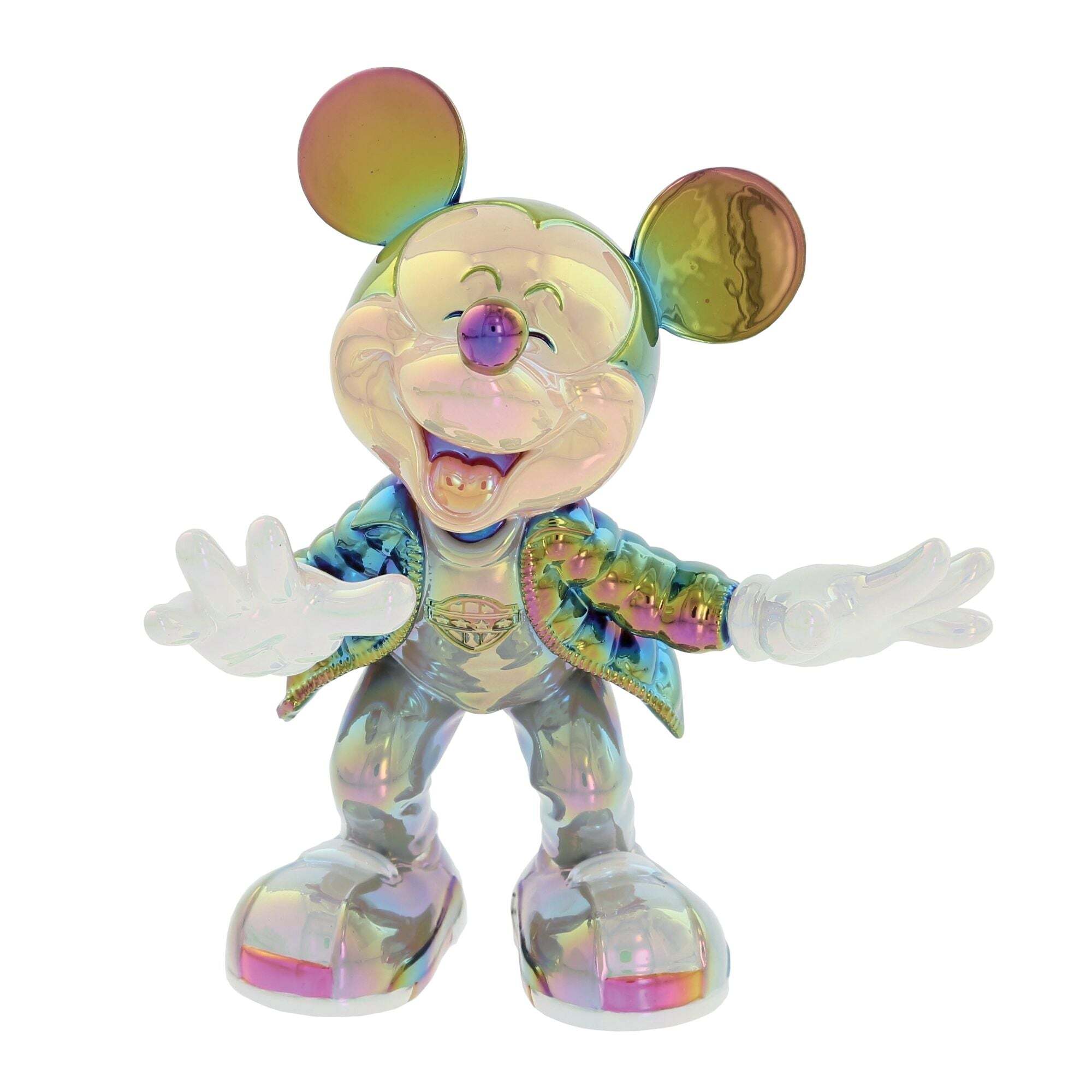 Esta figura representa a Mickey Mouse en una pose alegre y expresiva, capturando a la perfección su energía y su icónica sonrisa. Sus brazos abiertos y su expresión risueña transmiten todo la alegría y el espíritu lúdico asociados al universo Disney . La característica única de esta pieza reside en su acabado galvanizado con reflejos iridiscentes, que le confiere un aspecto moderno y luminoso. Los tonos metálicos cambiantes añaden un toque contemporáneo a este icónico personaje, a la vez que resaltan los detalles de la escultura. Decorativa y original a la vez, esta figura es una pieza ideal para los fans y coleccionistas de Disney que buscan añadir una creación única a su colección.