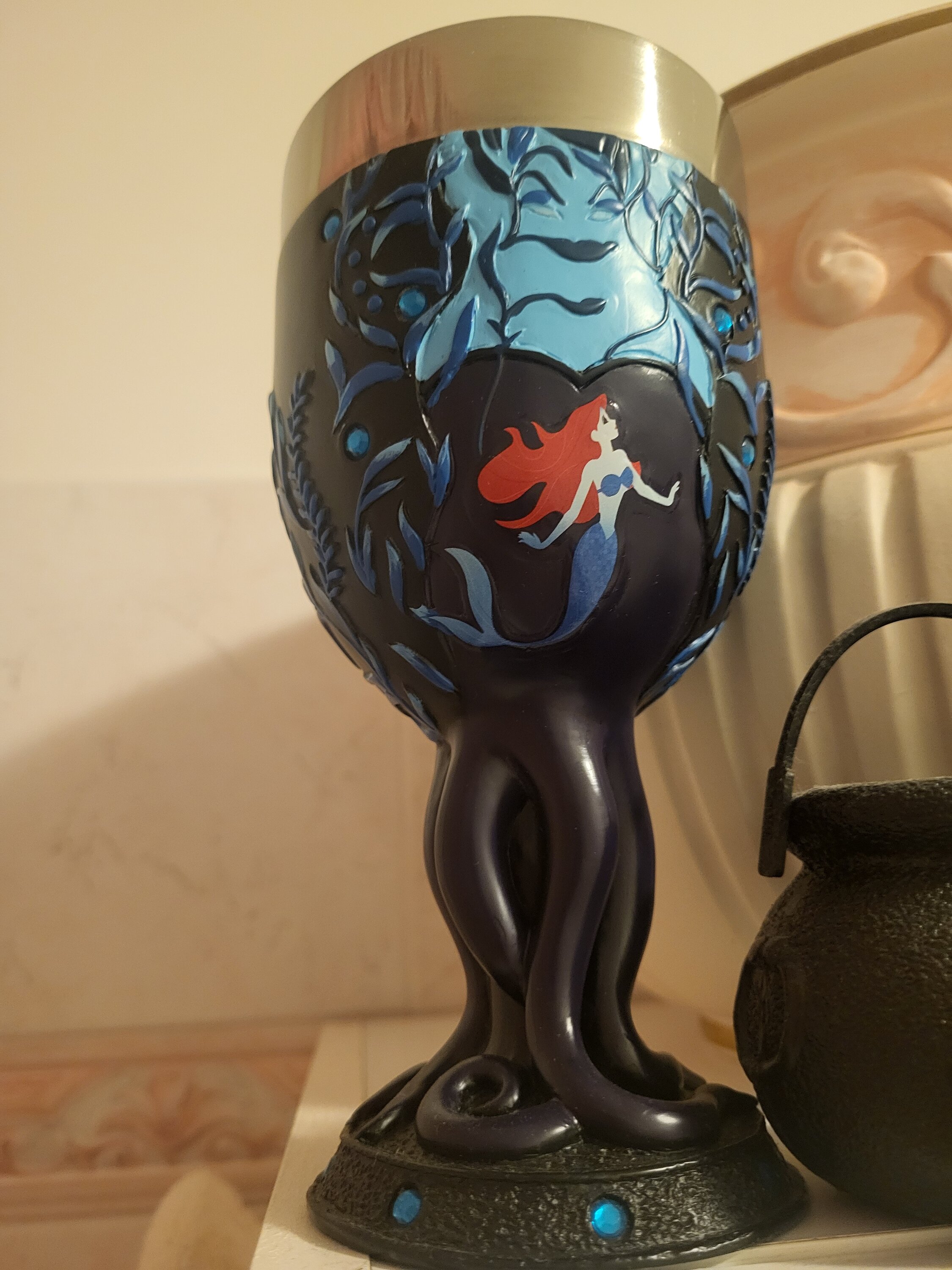 Este caliz de La Sirenita presenta a Ariel y su enemiga marina Ursula. Inserto de acero inoxidable para una fácil limpieza a mano. Las piedras preciosas artificiales añaden brillo.