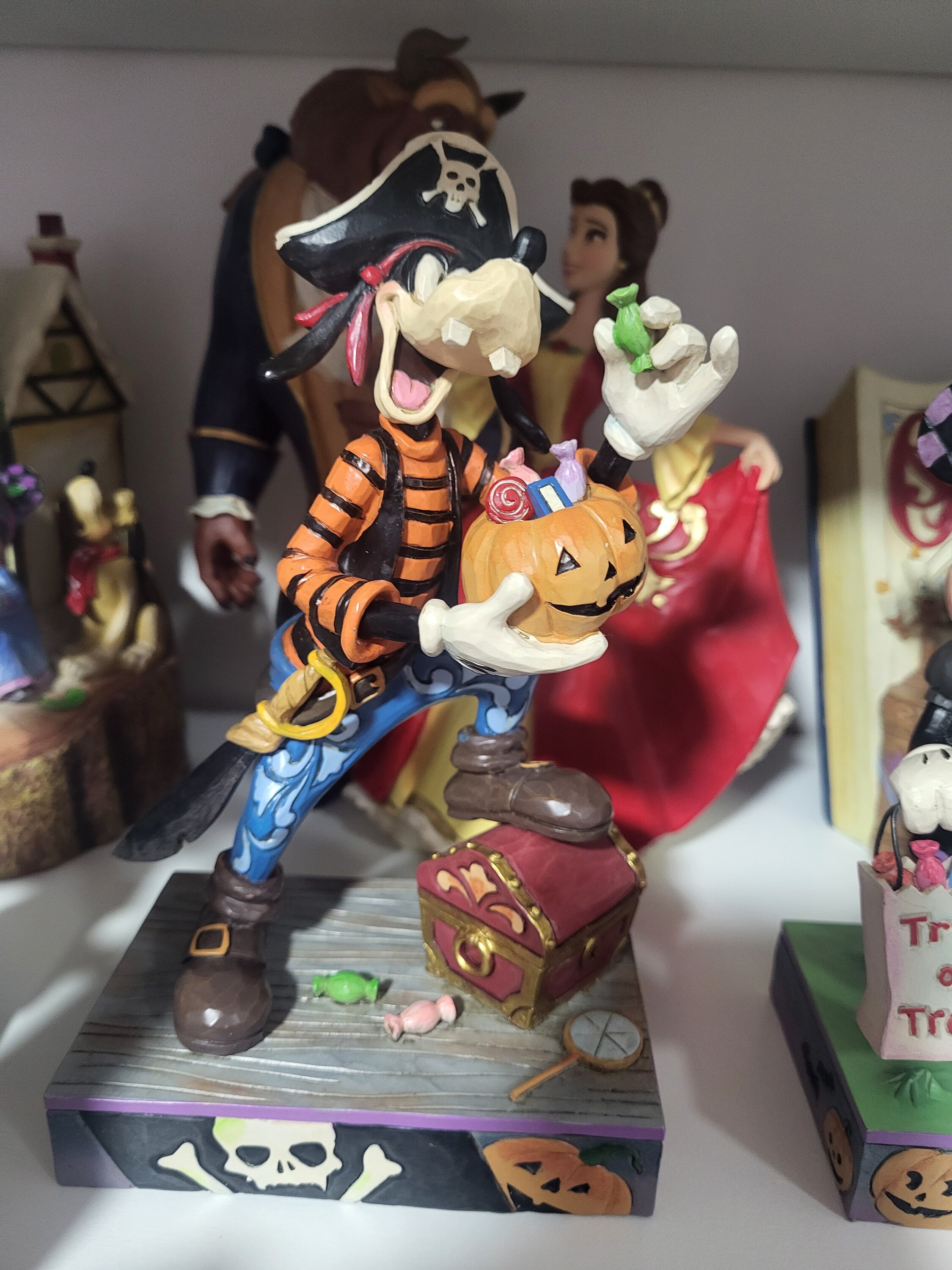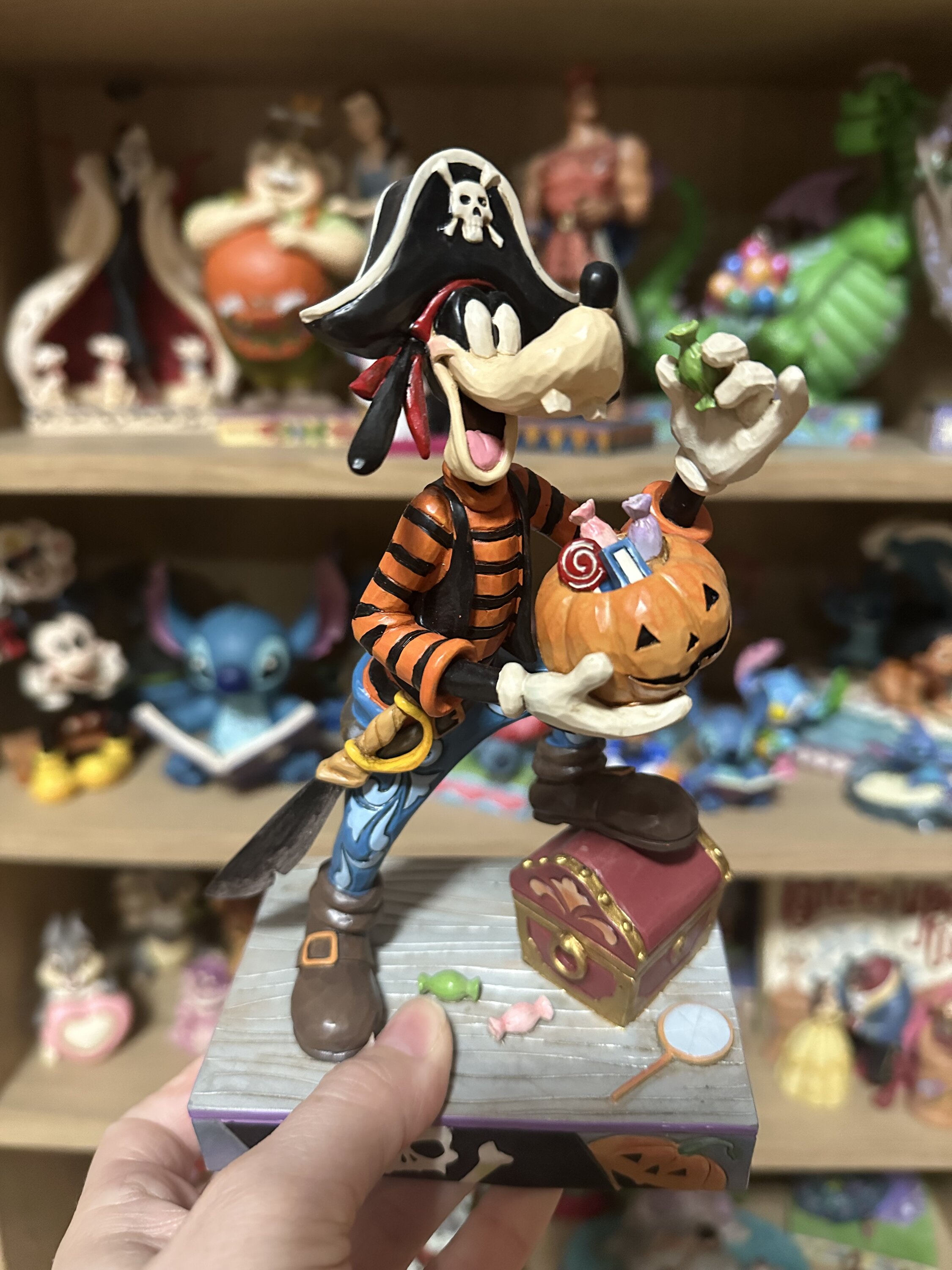 Goofy está disfrazado y listo para Halloween con su disfraz de pirata. Diseñado por Jim Shore para la colección Disney Traditions , está esculpido y pintado a mano.