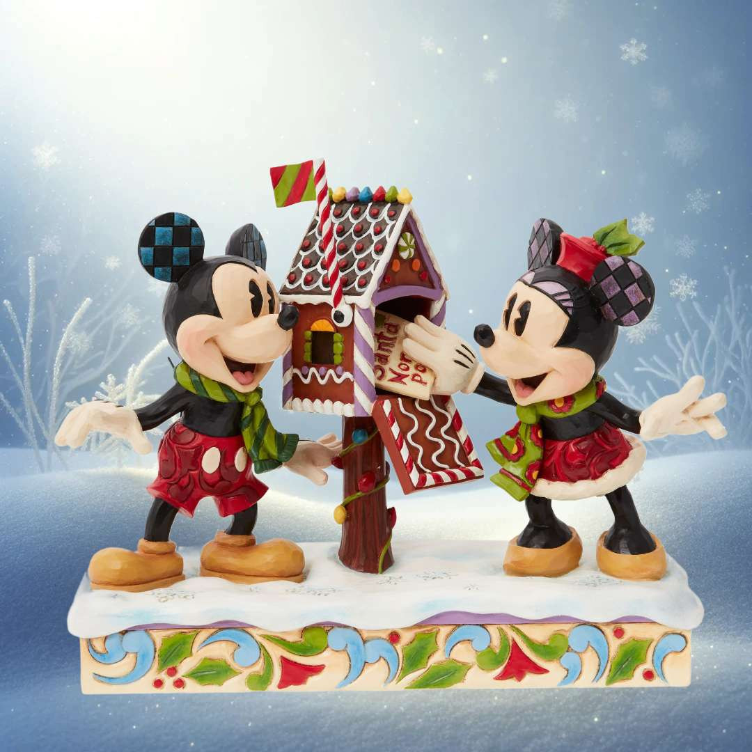 Mickey y Minnie Mouse se sumergen en el espíritu navideño con Disney Traditions de Jim Shore. Una hermosa figura festiva que presenta a la icónica pareja enviando su carta navideña a Papá Noel. Tallado y pintado a mano.
