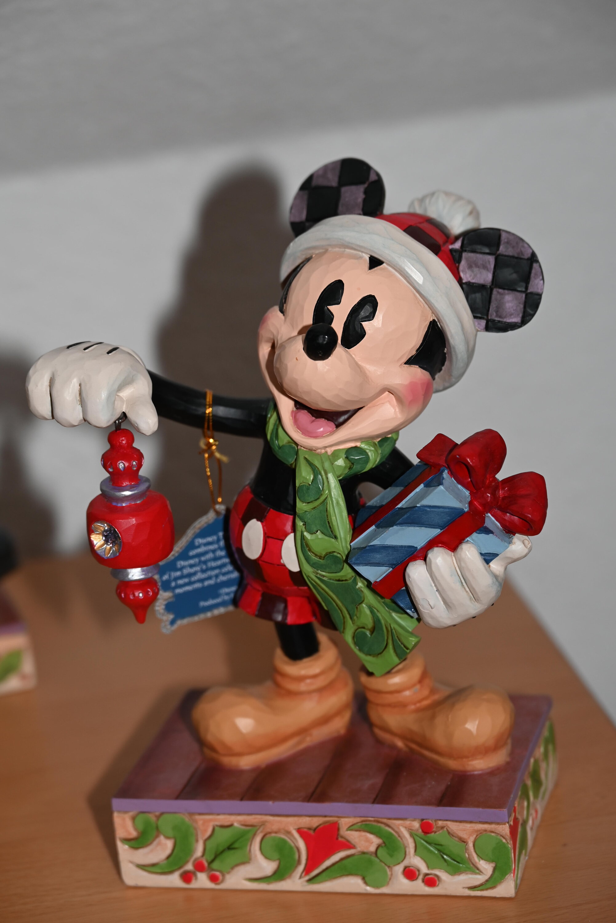Esta adorable edición limitada de Mickey Mouse Holiday de Jim Shore da inicio a la temporada holiday con una sonrisa reconfortante y una presencia encantadora. Mickey usa pantalones a cuadros y un sombrero a juego mientras entrega con alegría un adorno y un regalo cuidadosamente elegidos.