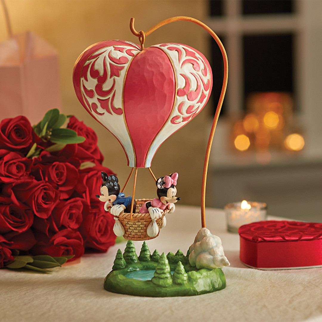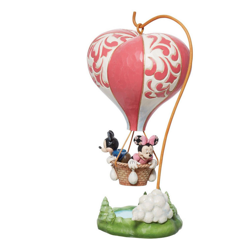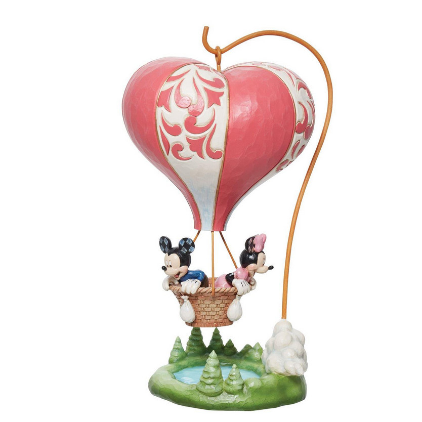 Impresionante figura de Mickey y Minnie a bordo de un globo aerostático en forma de corazón, propulsados por el amor, que ofrece una impresionante escena romántica.