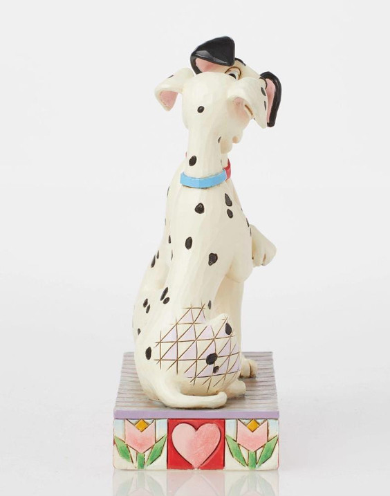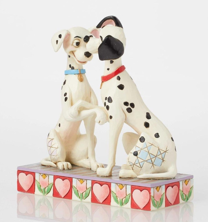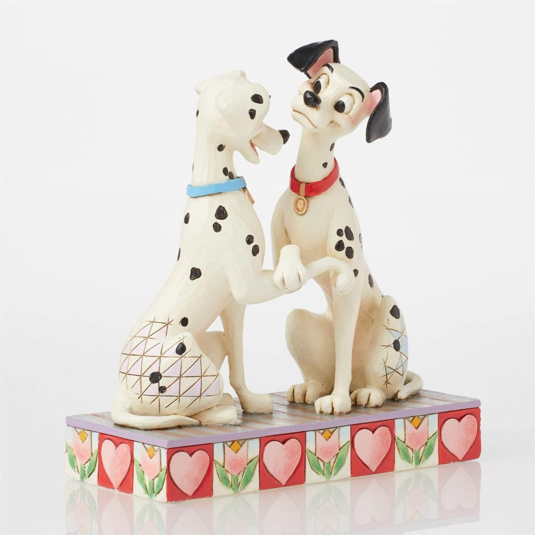 Los dos primeros de los 101 dálmatas, Pongo y Perdita, sostienen sus patas en este romántico diseño de Disney de Jim Shore. La pareja comparte amor en sus ojos mientras intercambian sonrisas de mejillas sonrosadas en esta adorable pieza de los amados perros.