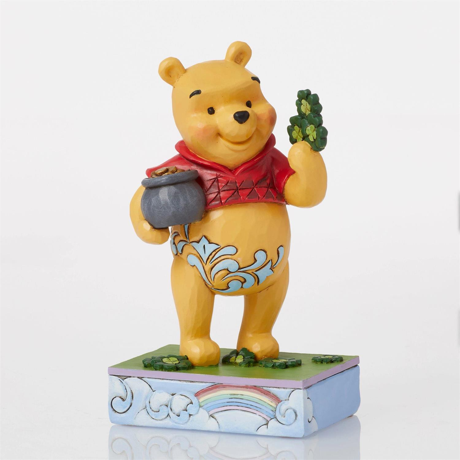 Winnie the Pooh abraza el espíritu del Día de San Patricio en esta figura de celebración de Jim Shore. Lleno de fantasía y asombro, Pooh cambia su tarro de miel por uno de oro y explora un campo de tréboles en busca de suerte en un escenario de arcoíris.