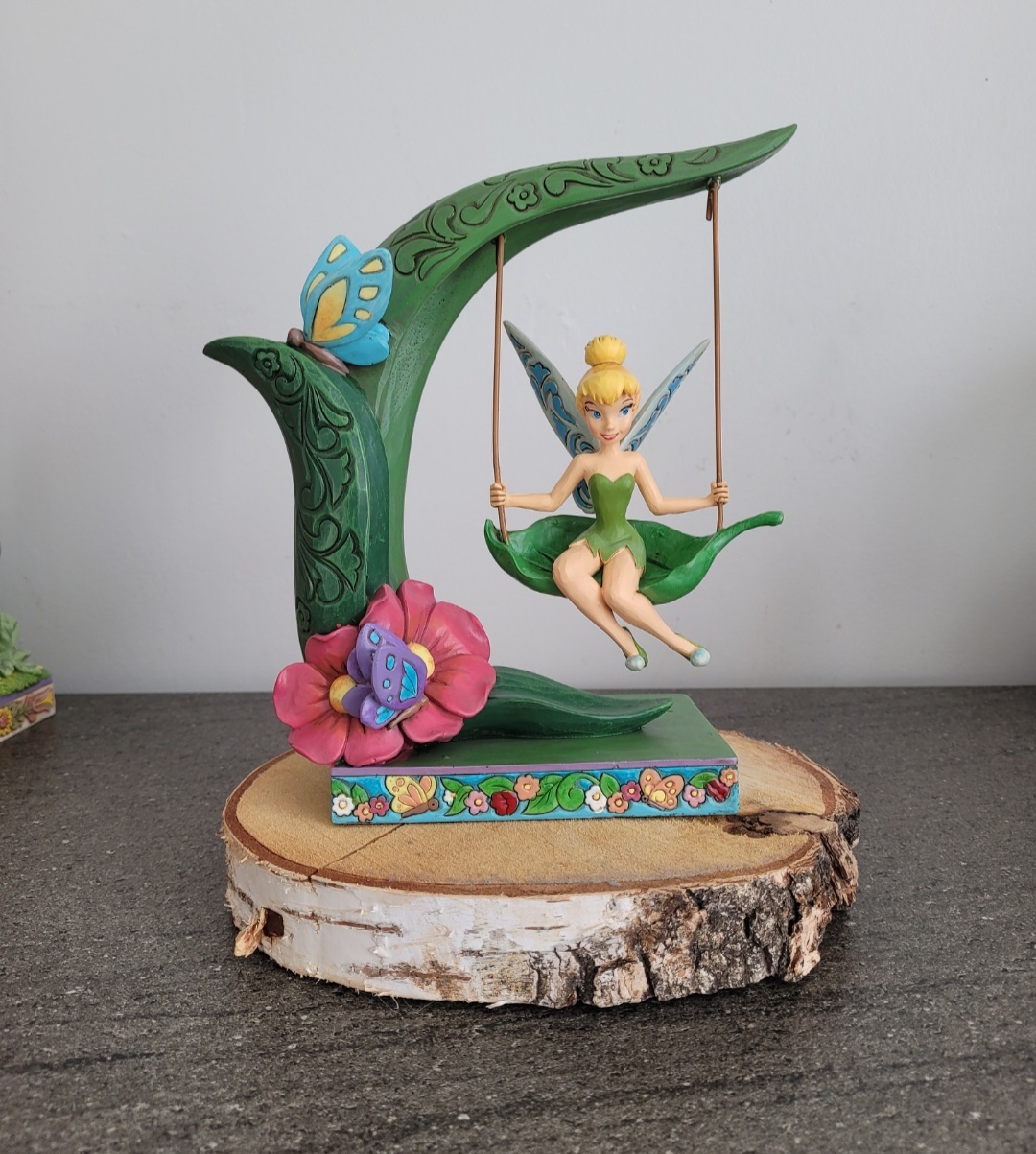 Esta colorida pieza del querido artista Jim Shore captura la fantasía de la querida hada de Disney, Tinkerbell, en un despreocupado día de primavera. Encaramada en un columpio de árbol entre flores coloridas, Campanilla sonríe alegremente ante la belleza de la naturaleza.
