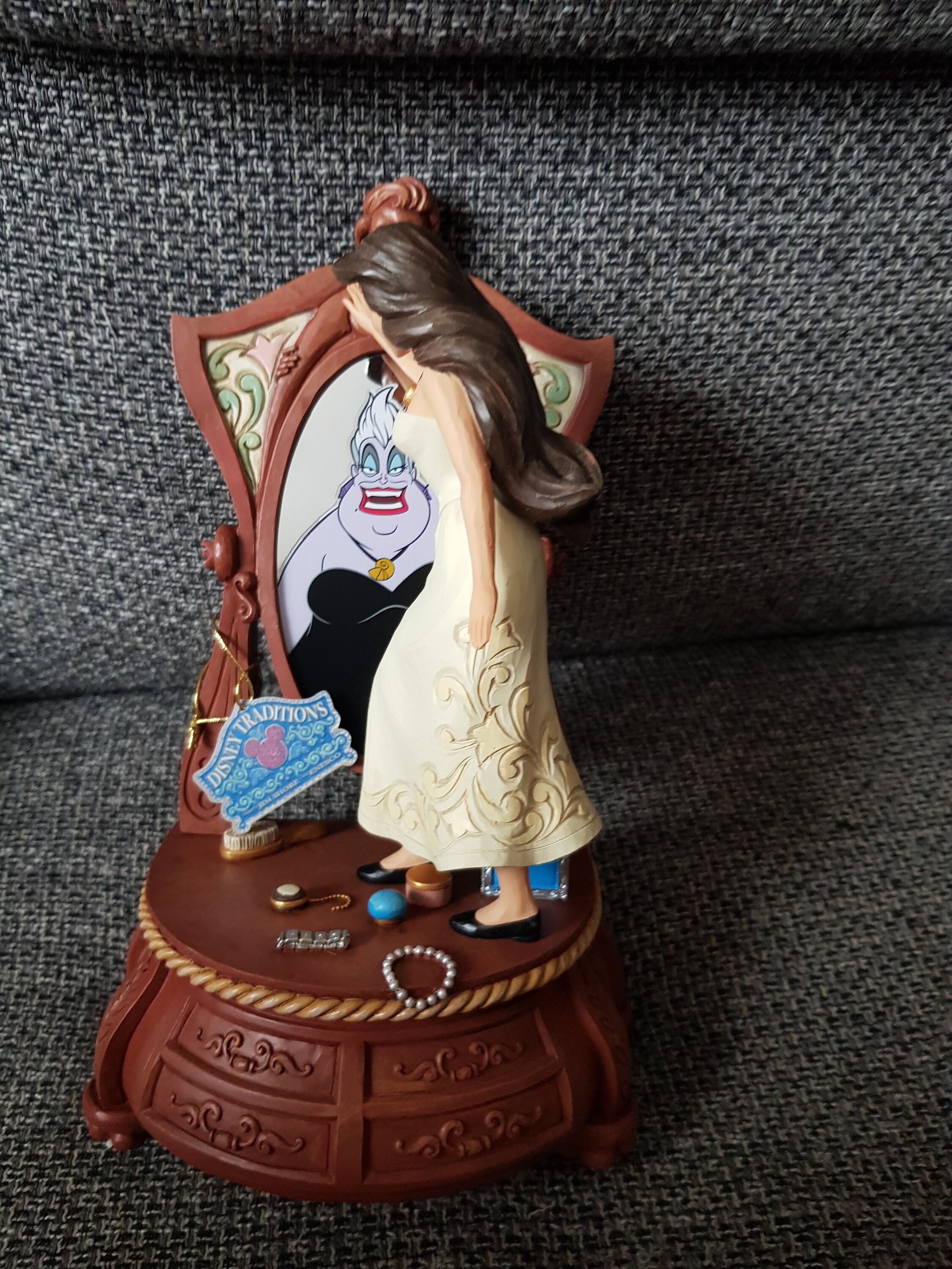 Una pieza maravillosa que representa la escena más icónica de Úrsula como humana. Los detalles del espejo son maravillosos, aunque el rostro de Vanessa lo es un poco menos, pero al estar girado, dejándola expuesta, apenas se nota. ¡Es una pieza absolutamente preciosa que no podía faltar en mi colección Disney!