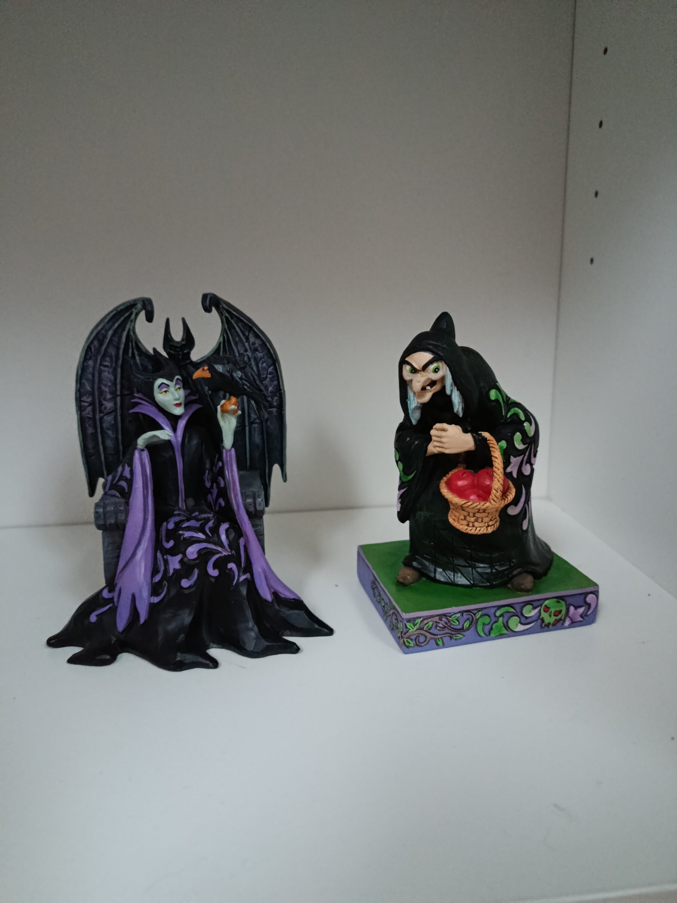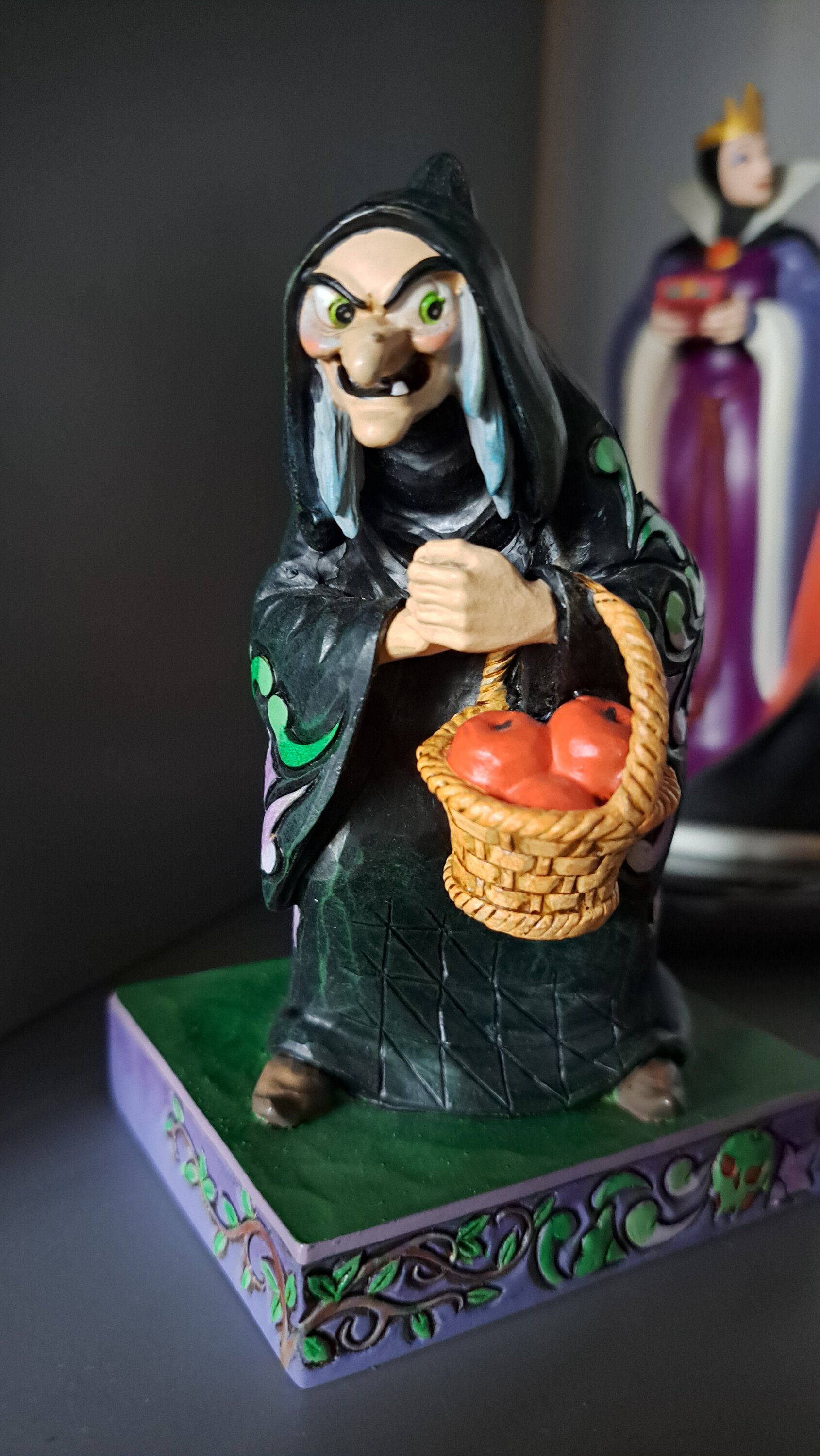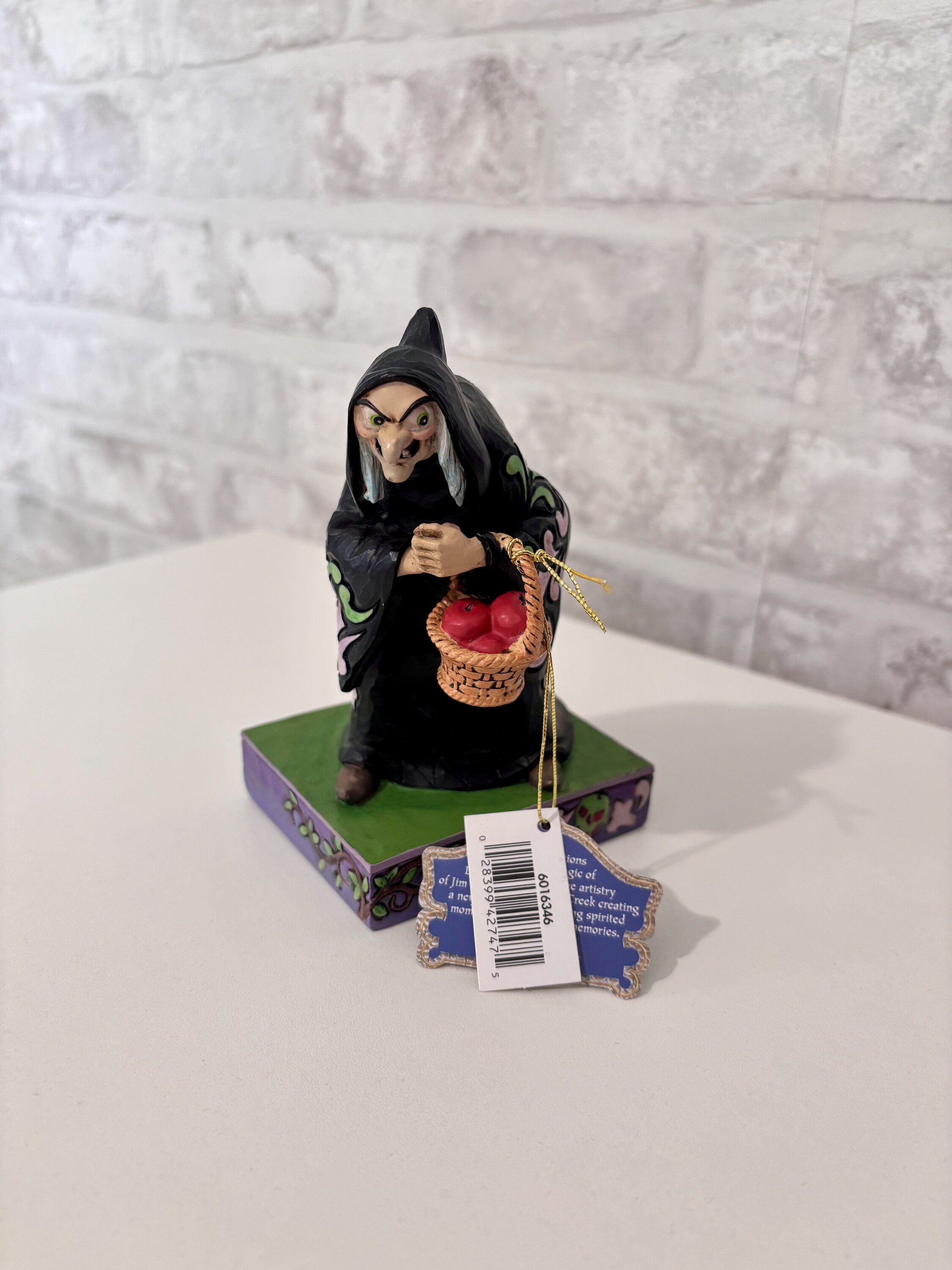 Con una apariencia siniestra, la malvada la bruja acecha en las sombras como una anciana, con su capa negra adornada con vibrantes rosas de Jim Shore , mientras lleva una cesta llena de manzanas envenenadas. Sus intenciones rezuman malicia y engaño.