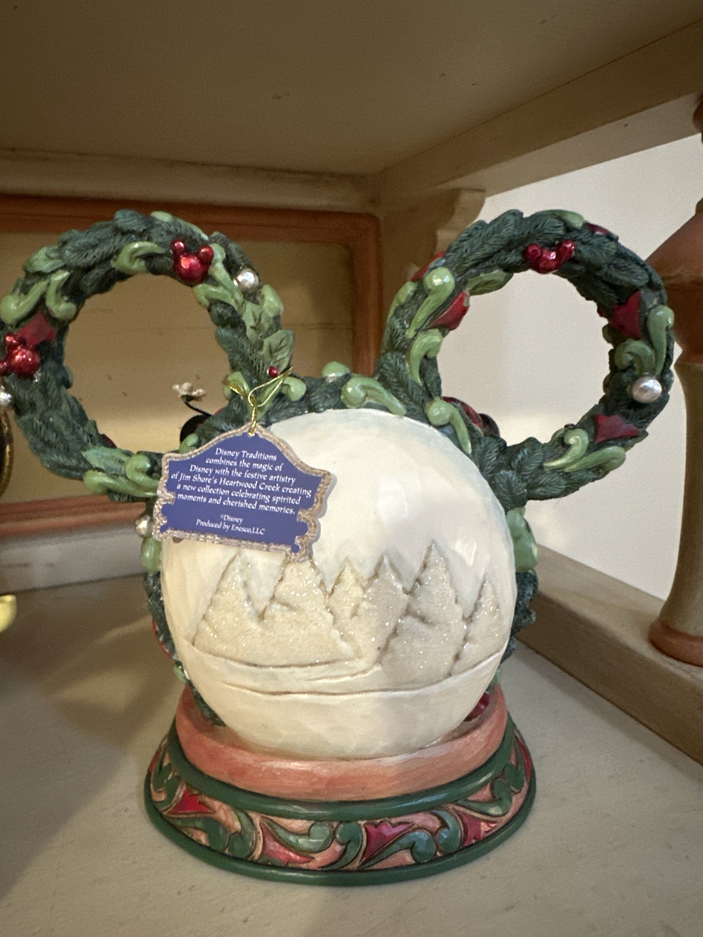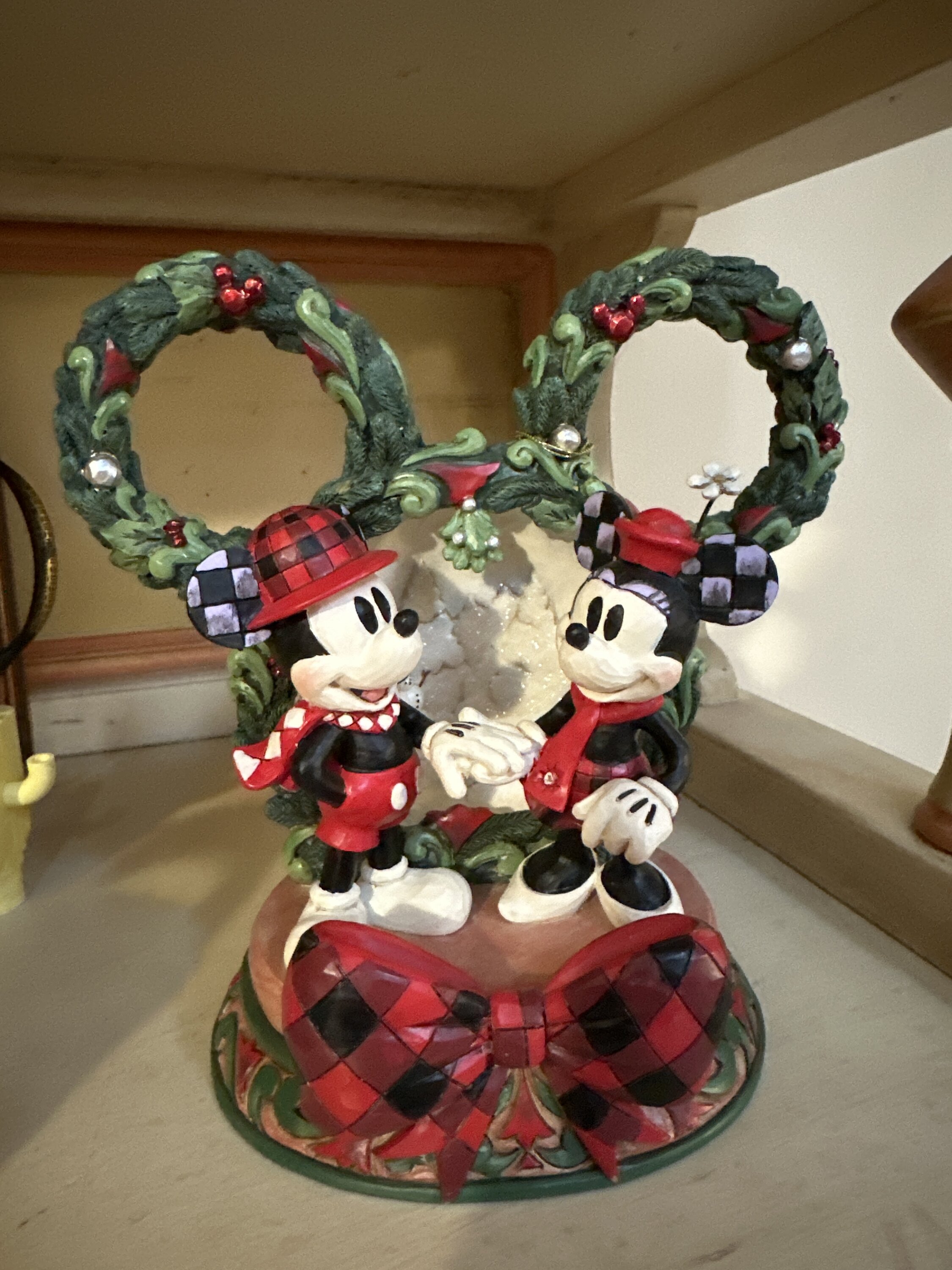 Esta encantadora escena Navidad de Jim Shore captura a Mickey y Minnie tomados de la mano debajo de un diorama LED brillante, enmarcado por una guirnalda festiva con forma de Mickey adornada con bayas y detalles de perlas. Irradia magia estacional con encanto holiday .