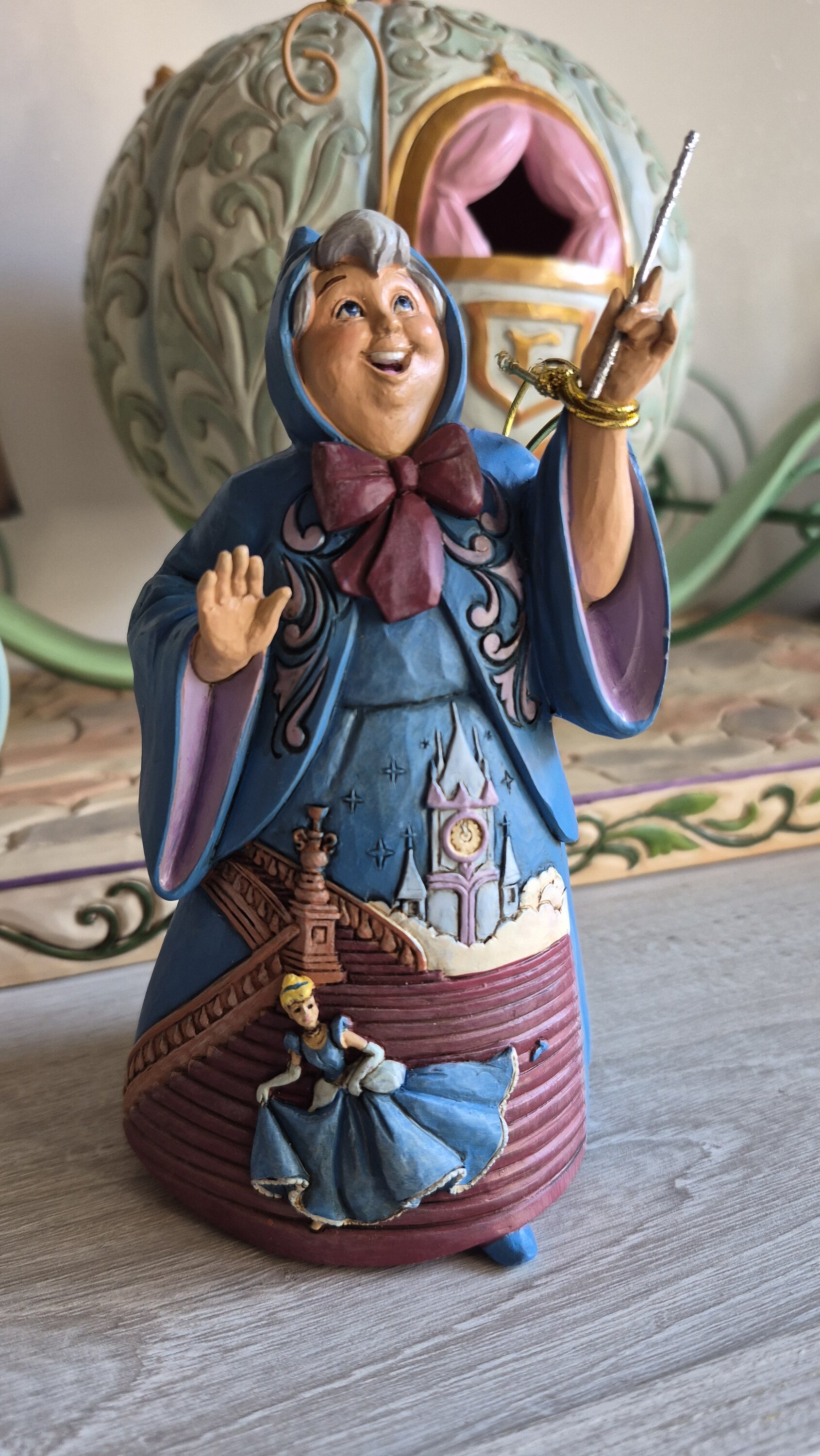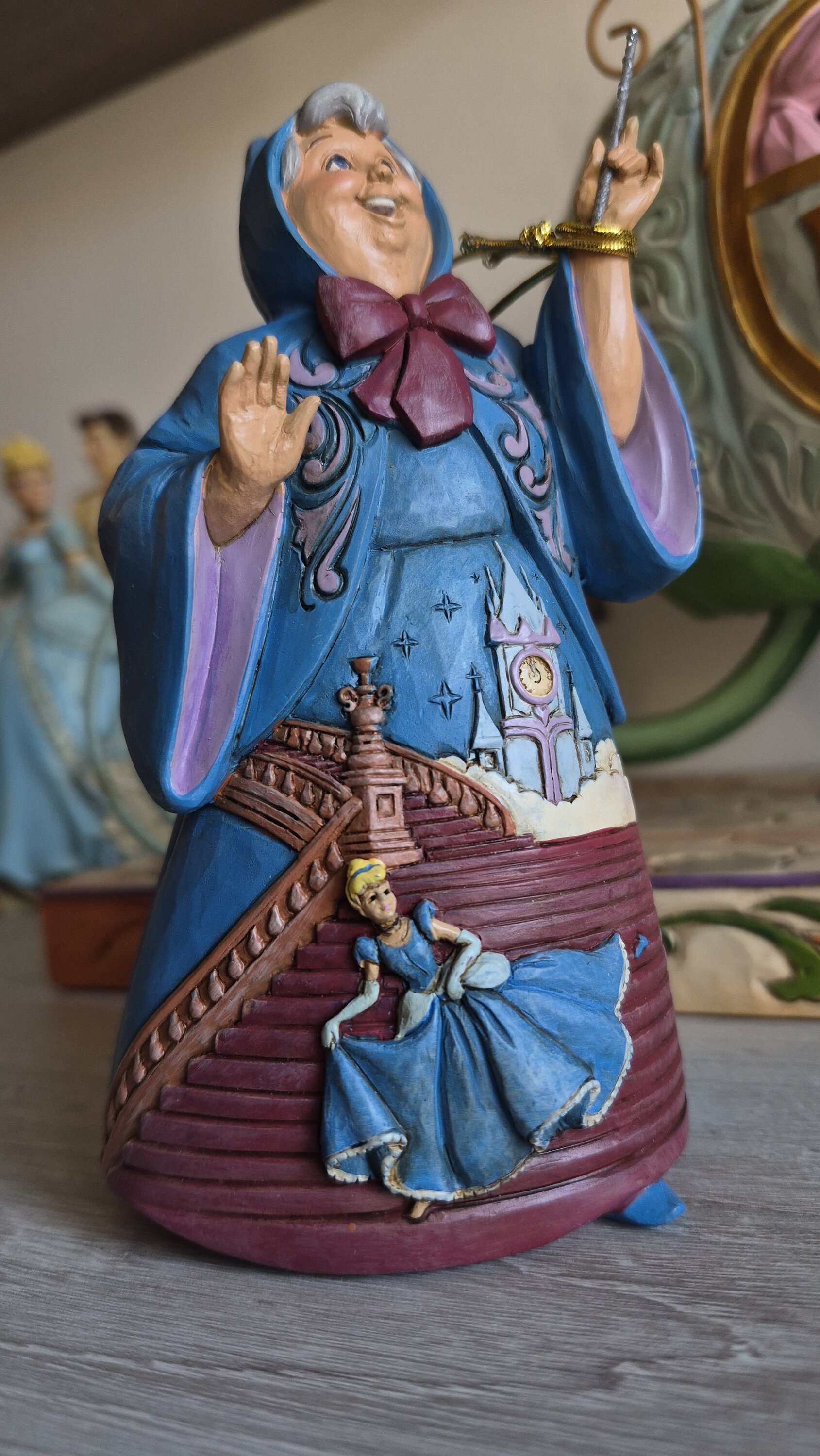 En este mágico diseño de Jim Shore, la Hada Madrina sonríe con su varita, su túnica azul rojiza se abre para revelar a Cenicienta corriendo por las escaleras mientras el reloj marca la medianoche. Este cautivador momento es cuando perderá su zapatilla de cristal.