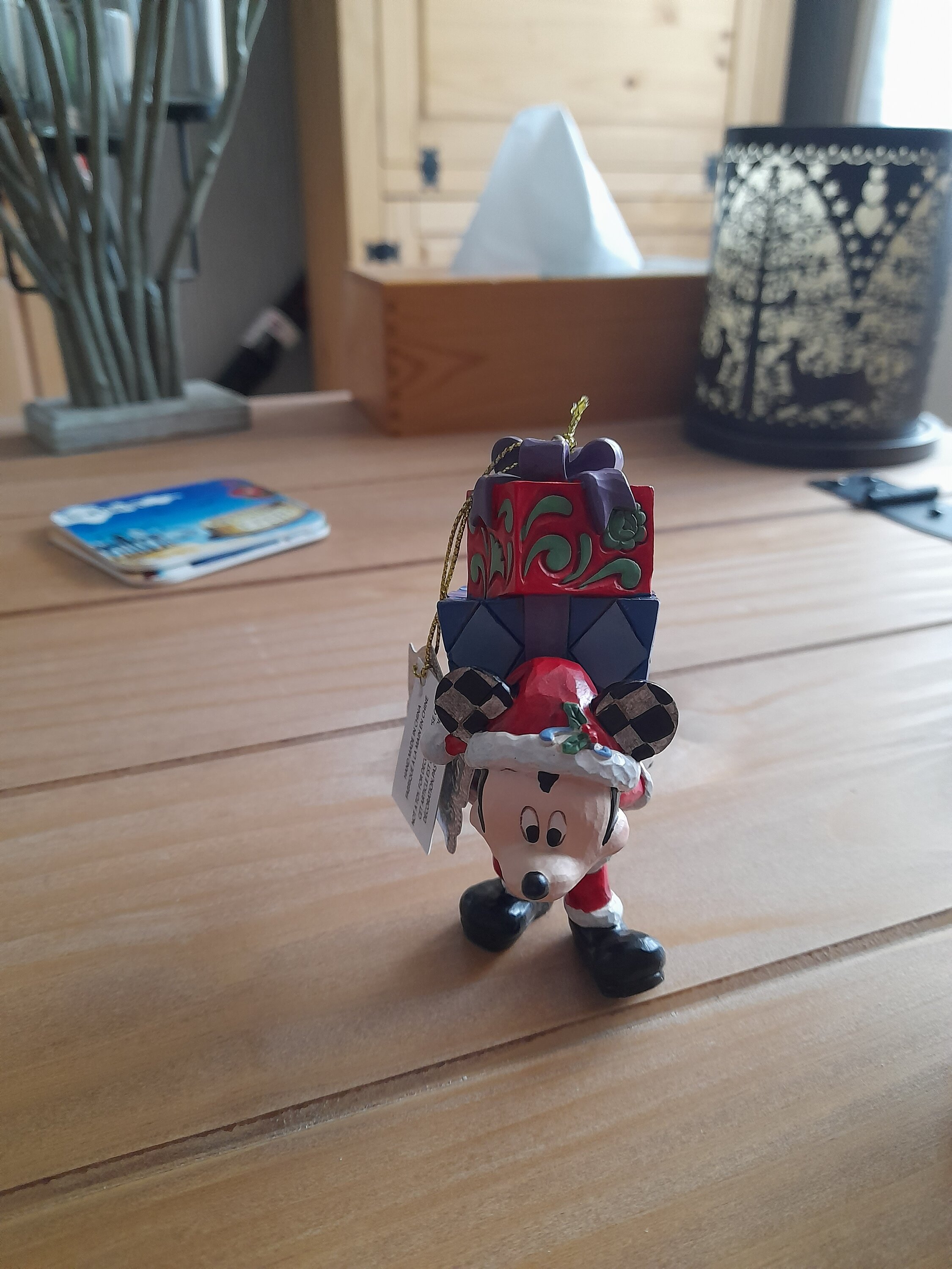 Adorno colgante de Mickey Mouse llevando regalos a la espalda. Estas figuras no son juguetes para niños. Solo para adultos.