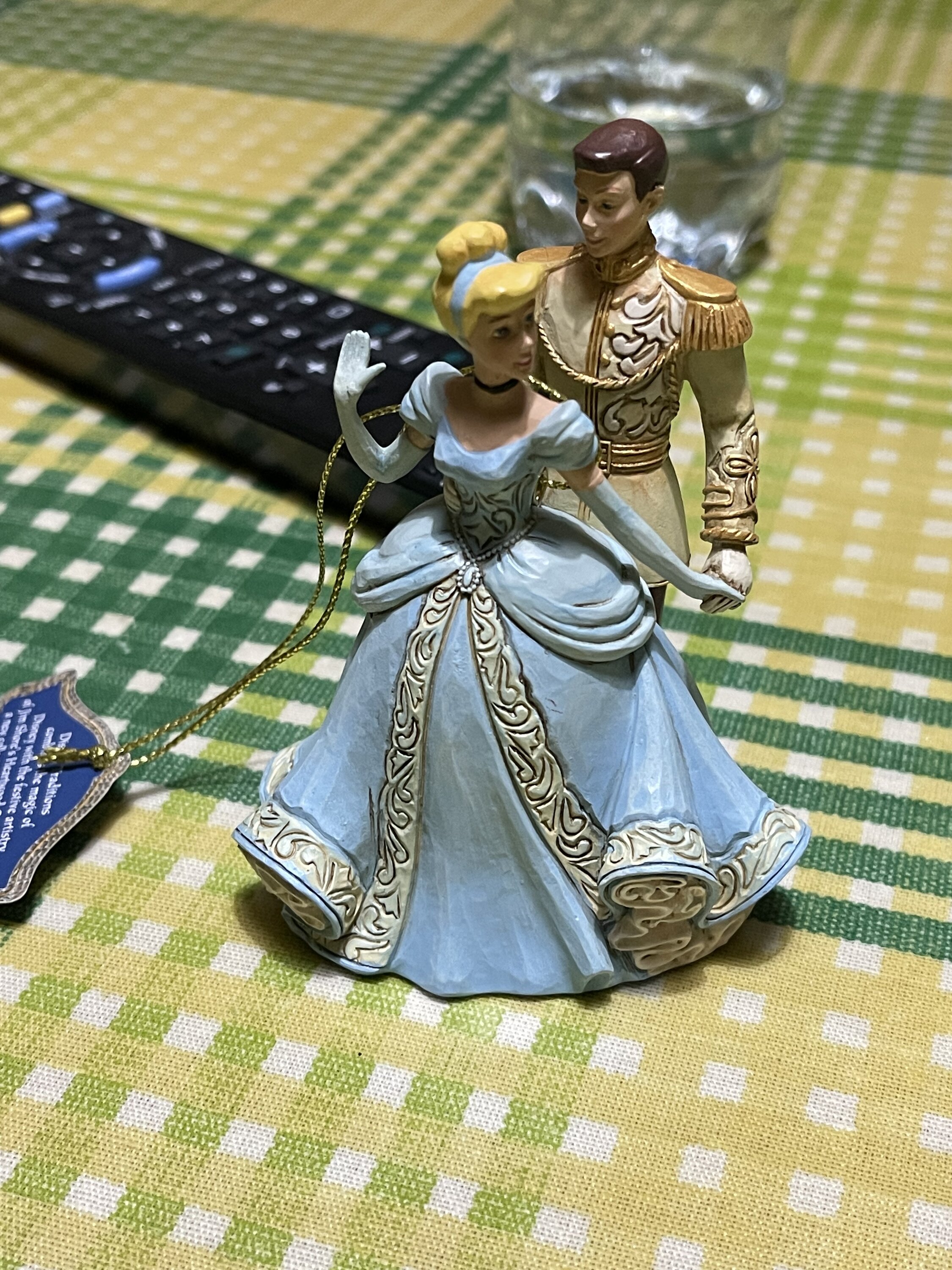 Cenicienta y el Príncipe: más bonitos en persona que en la foto. Aunque la figura está diseñada para colgarse, me encantó porque se puede colocar sobre una superficie sin que se caiga.