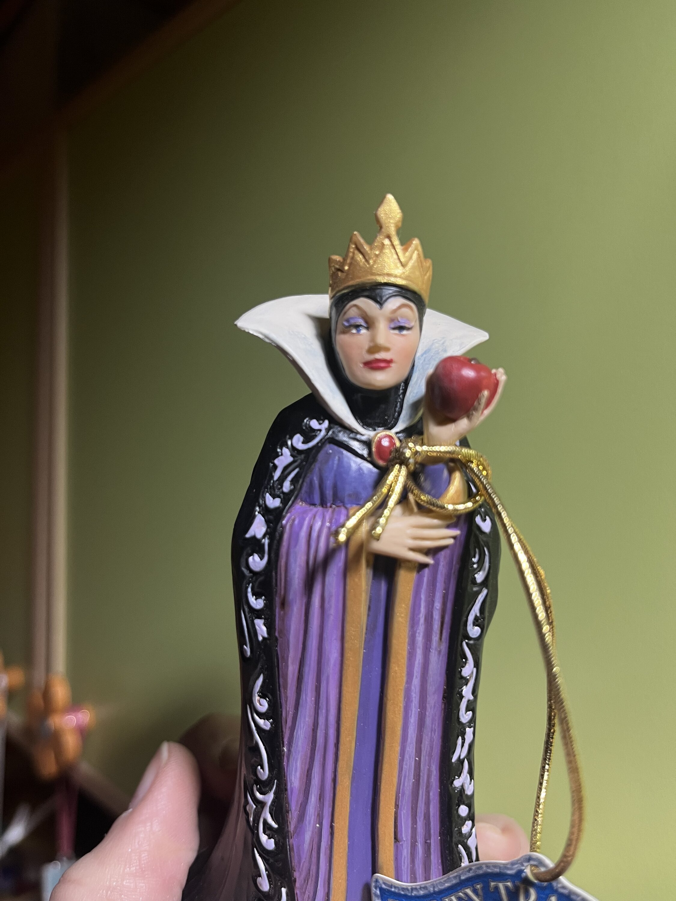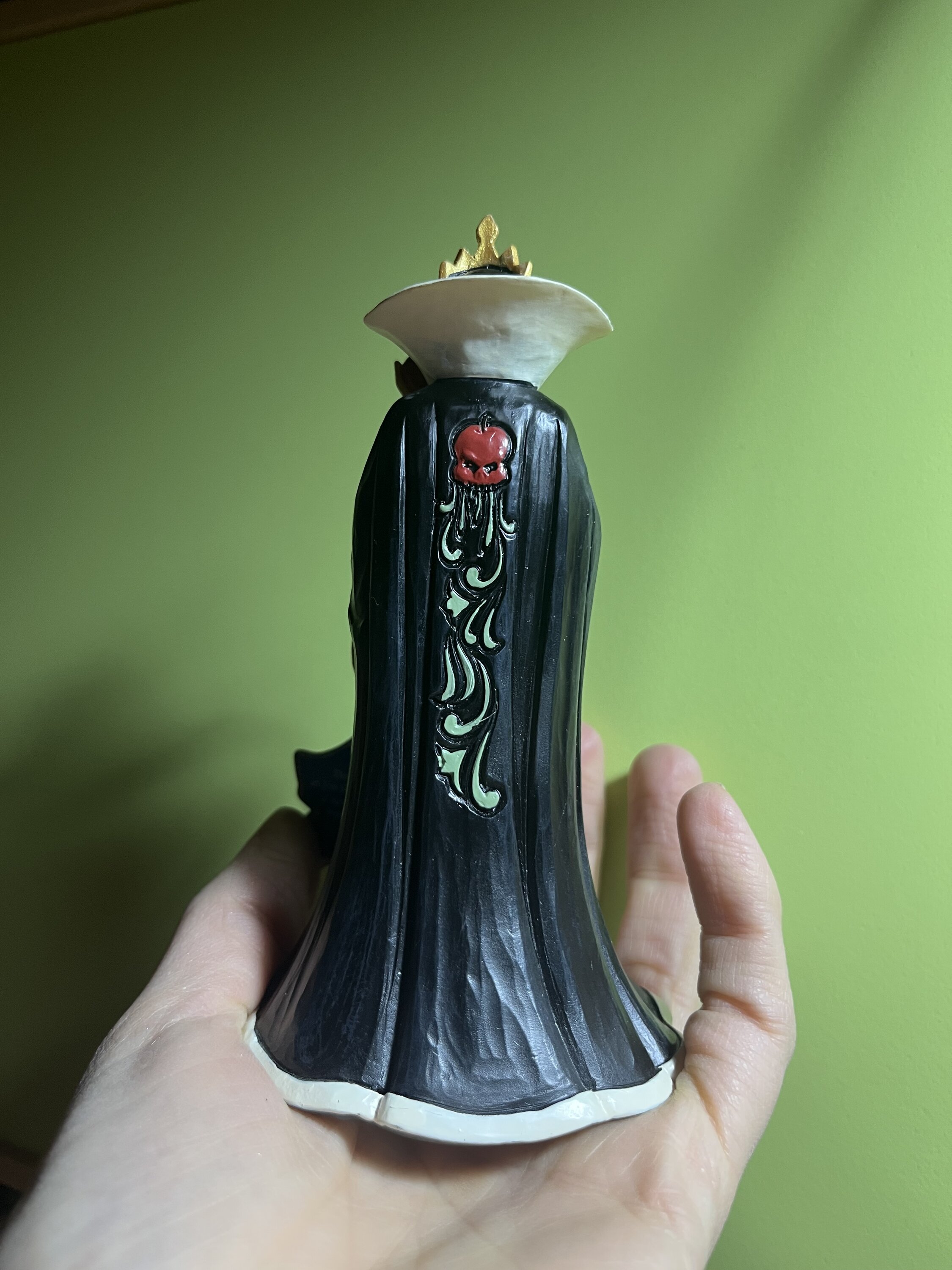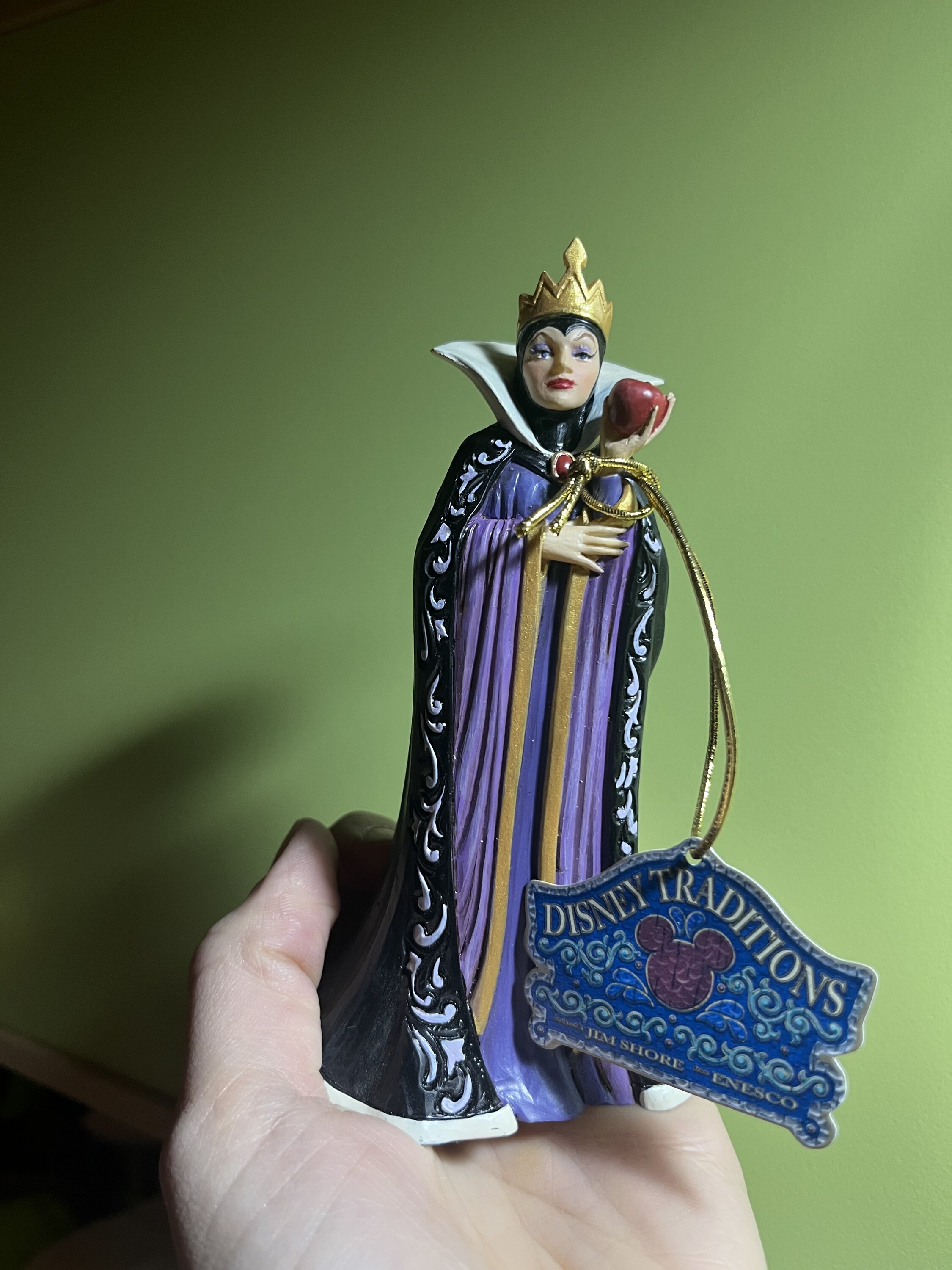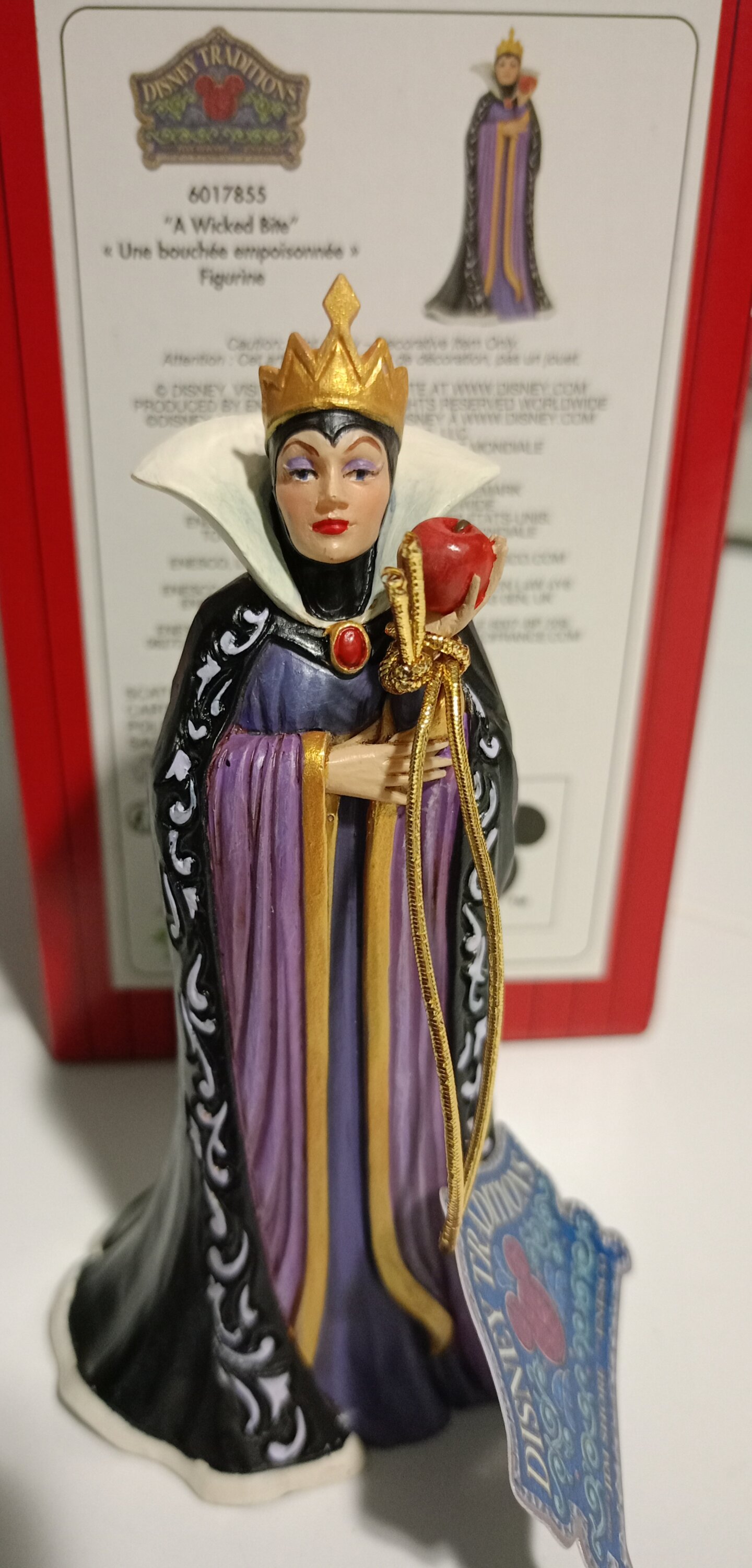 La Reina, Grimhilde, luce un llamativo vestido negro y morado adornado con los característicos patrones de rosemaling y quilting de Jim Shore. Sosteniendo una manzana envenenada destinada a Blanca Nieves, su corazón celoso alimenta sus oscuras intenciones mientras planea su próximo movimiento.