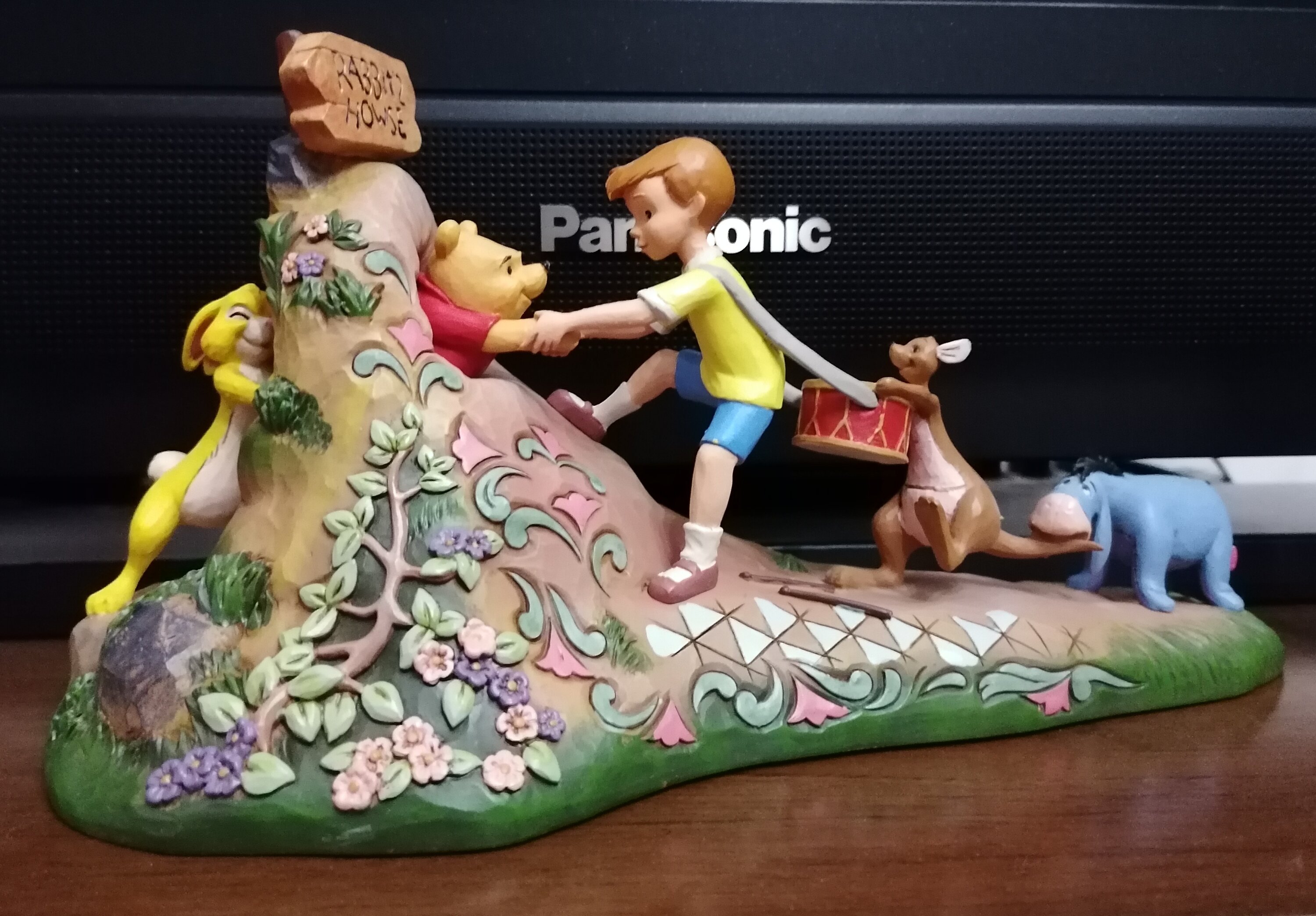 Tras una celebración en el Bosque de los Cien Acres, Pooh necesita ayuda para salir de la Casa de Conejo. Christopher Robin, Kanga e Ígor tiran de las manos de Pooh mientras Conejo lo empuja por detrás. Adornada con los icónicos detalles de Jim Shore y suaves detalles florales.