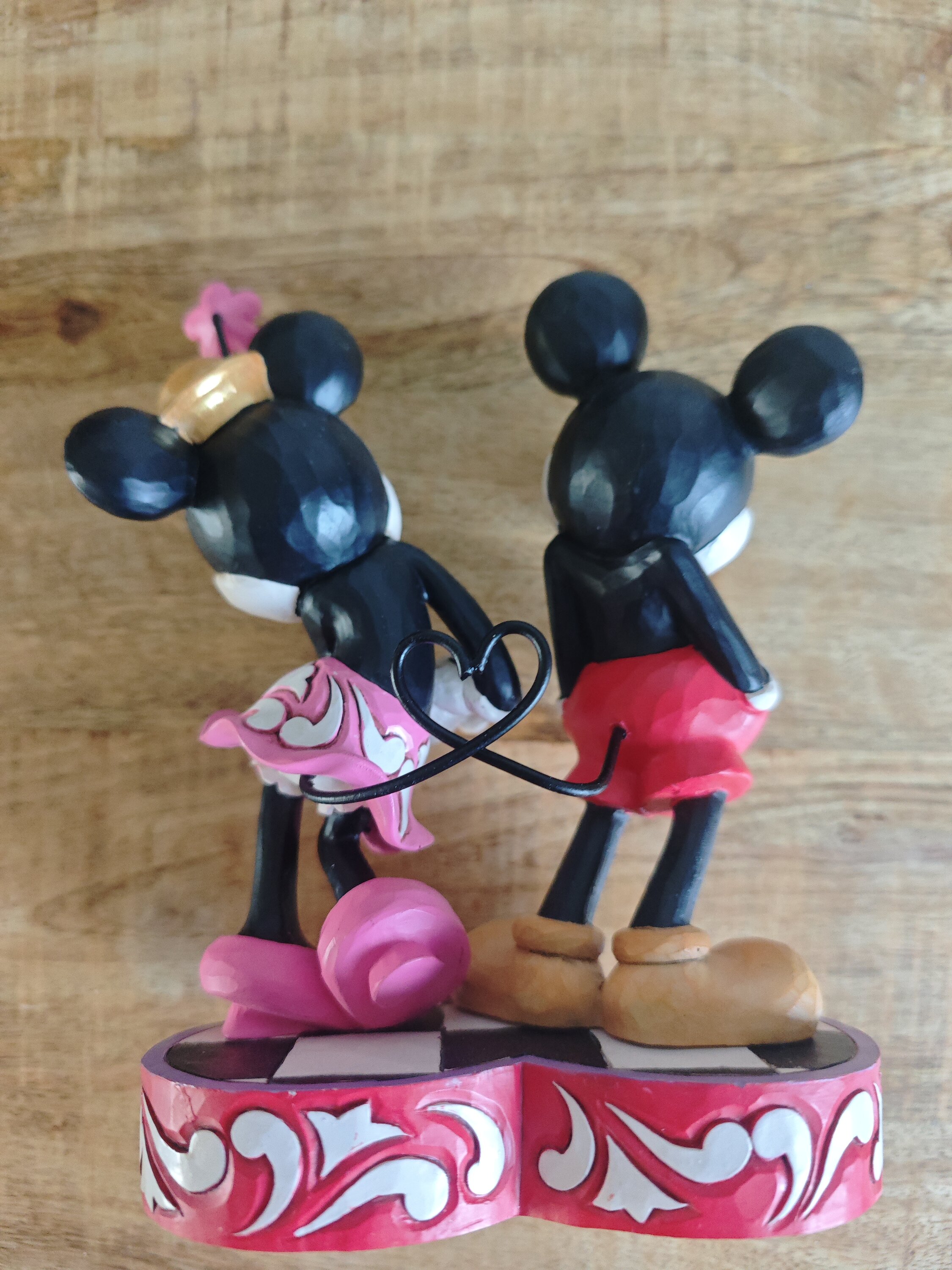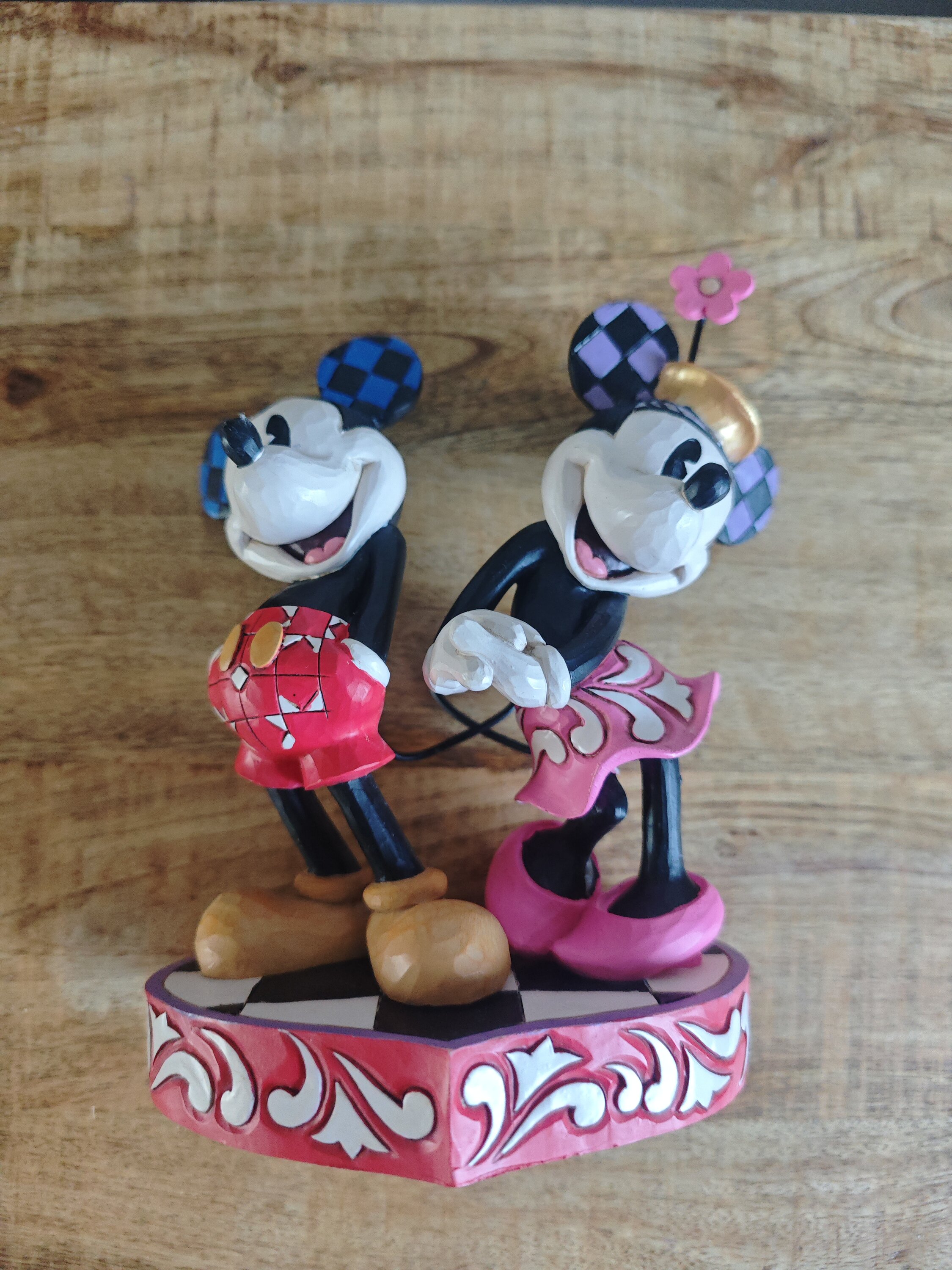 Esta romántica creación de Jim Shore destaca a Mickey y Minnie, vestidos con los característicos diseños de rosemaling y patchwork del artista. Unidos con cariño sobre una base en forma de corazón, irradian ternura y encarnan a la perfección la calidez de su amor eterno.