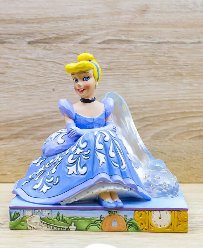 Esta línea Disney Traditions presenta a las icónicas princesas de Disney con sus accesorios resaltados en una resina transparente. Esta pieza presenta a Cenicienta con su vestido azul brillante y una zapatilla de cristal.