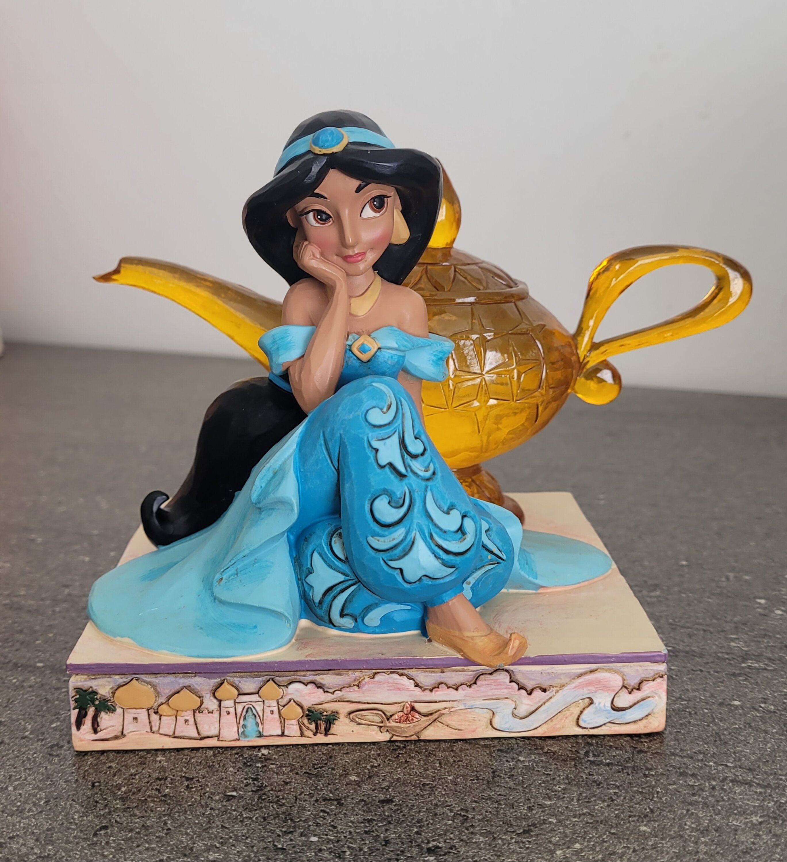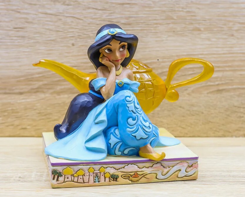 Esta línea Disney Traditions presenta a las emblemáticas princesas de Disney con sus accesorios resaltados en una resina transparente. Esta pieza representa a Jasmin imaginando una nueva vida junto a la lámpara del Genio.
