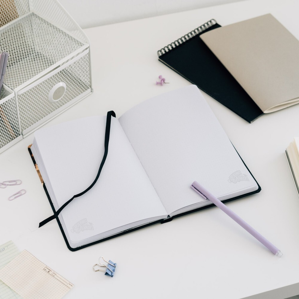 Cuenta con una cubierta laminada mate suave al tacto, páginas punteadas personalizadas, esquinas redondeadas, encuadernación encolada y un marcapáginas de cinta. Contiene 96 hojas (192 páginas) de papel de 100 g/m².