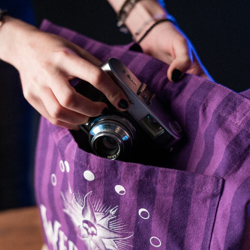 bolsa tote de algodón de alta calidad. Presenta un diseño estampado, cierre de cremallera, bolsillo exterior y correas para el hombro.