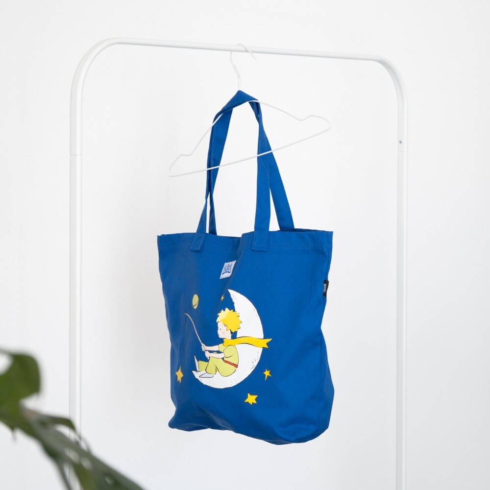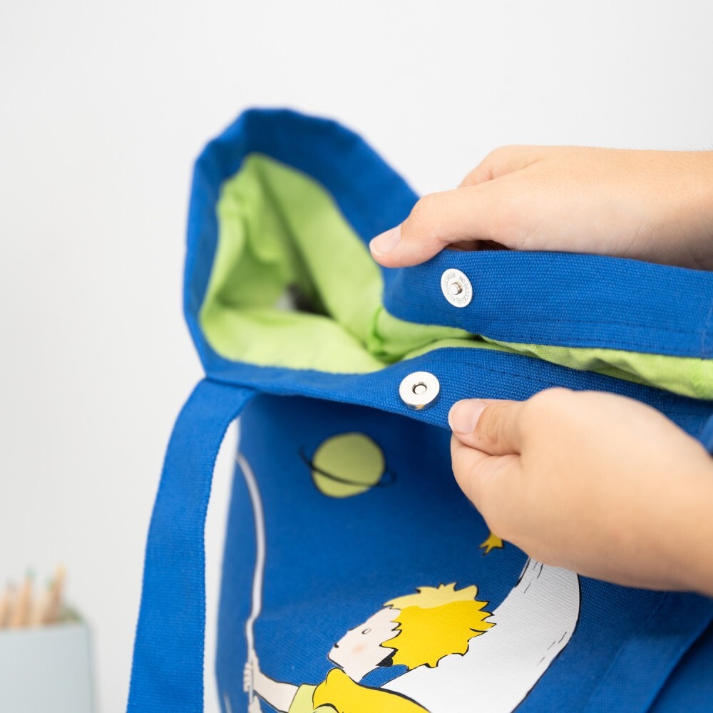 bolsa tote premium de El Principito. Fabricado en 100 % algodón. Cuenta con un bolsillo exterior con cremallera.