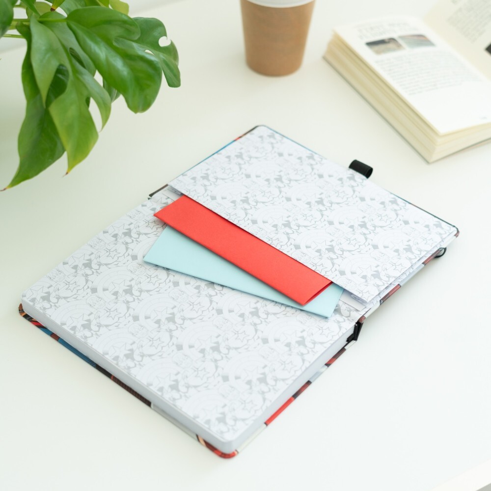 Cuaderno A5 (14,8 x 21 cm) con bolígrafo. Cuenta con tapa dura con detalles en relieve y acabado suave al tacto, esquinas redondeadas, encuadernación encolada, interior personalizado con viñetas, cinta marcapáginas, bolsillo interior y cierre elástico. El interior contiene 96 hojas (192 páginas) de papel de 100 g/m². Incluye bolígrafo y goma elástica.