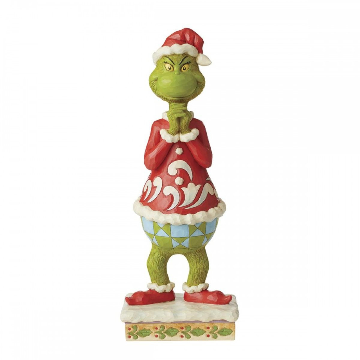 Grinch con las manos entrelazadas debajo de la barbilla piensa en sus planes para robar la Navidad. Jim Shore captura la colorida personalidad del Grinch en esta estatua hecha a mano de 20", al tiempo que agrega su propio diseño de arte popular inconfundible.