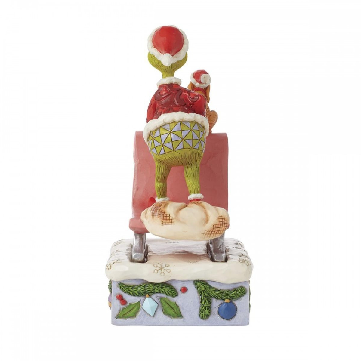 Esta figura representa al Grinch y su fiel perro, Max, en un trineo, deslizándose por la nieve hacia Chouville. Disfrazado de Papá Noel, el Grinch trae consigo una gran bolsa vacía que llenará robando los regalos de los niños de Chouville. De la colección Grinch, diseñada por el galardonado artista y escultor Jim Shore. Cada figura está pintada a mano y se esperan ligeras variaciones de color, lo que hace que cada pieza sea única. Empaquetado en una caja de regalo. Estos artículos no son juguetes para niños. Destinado únicamente a adultos.