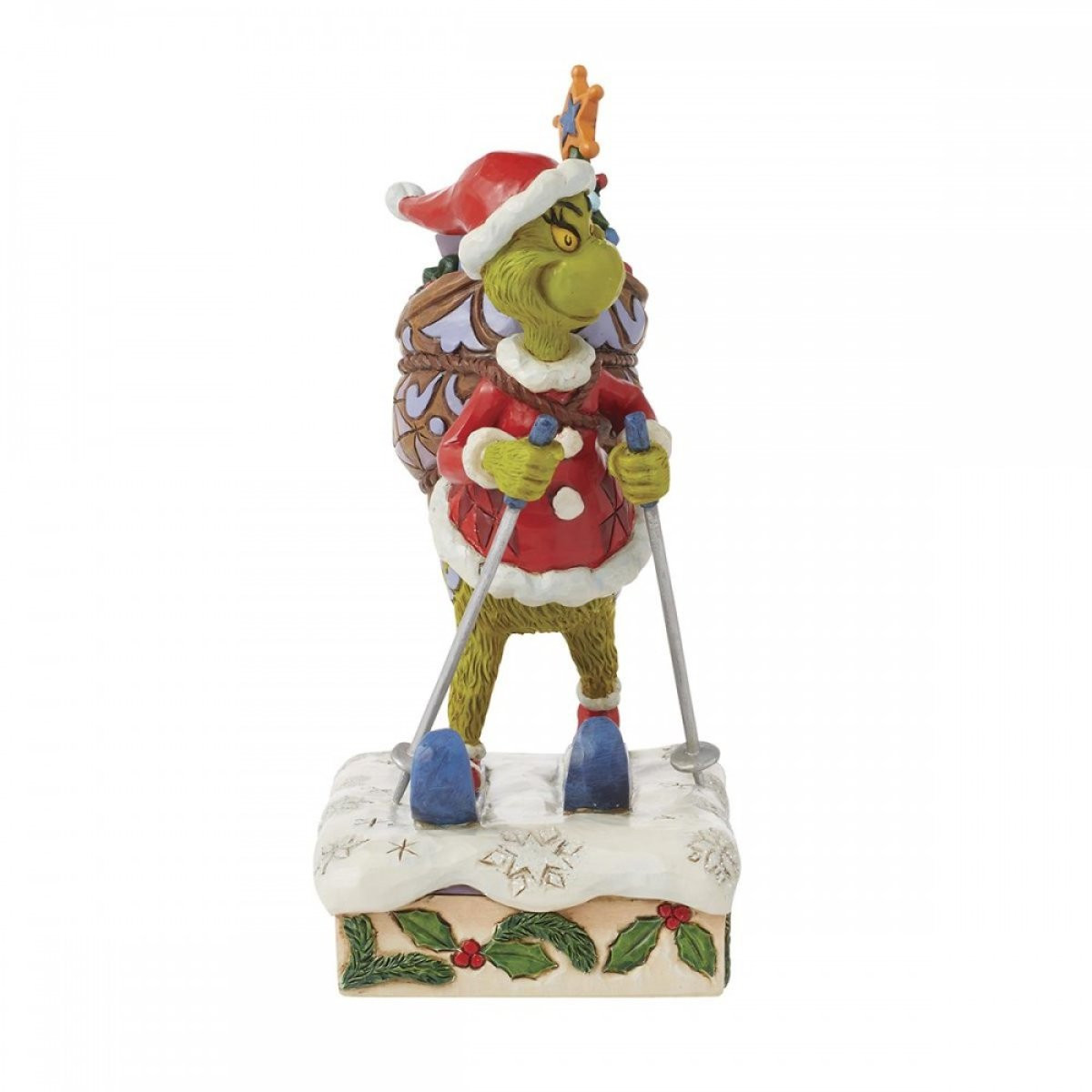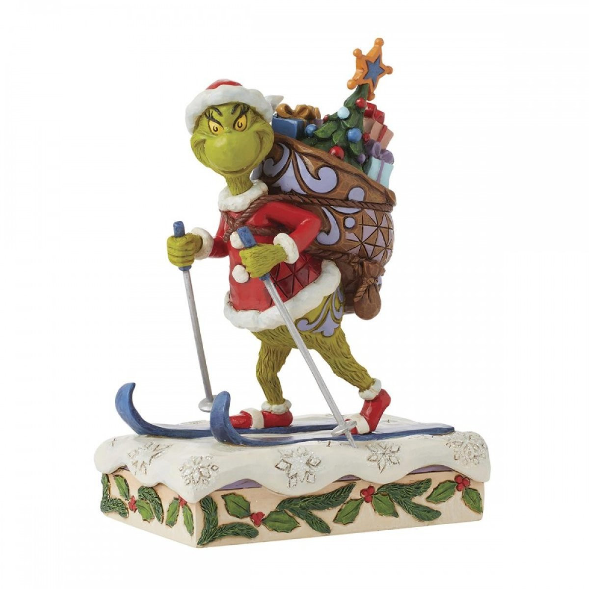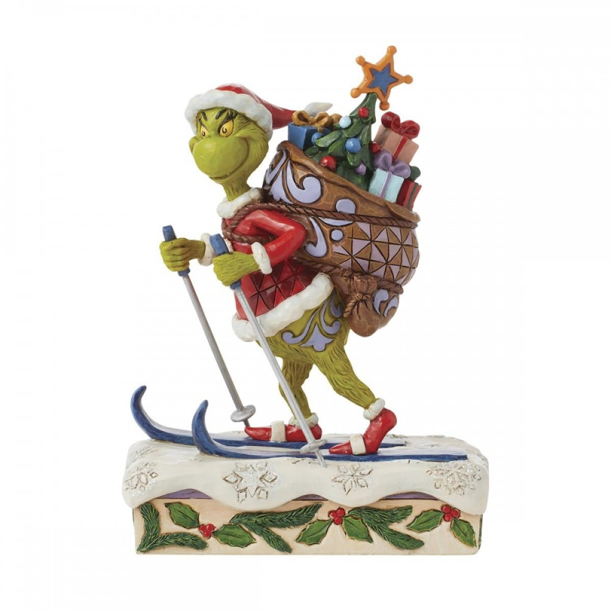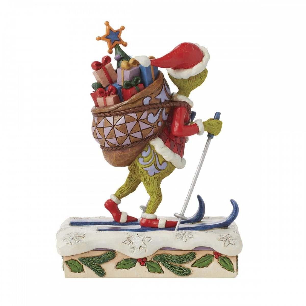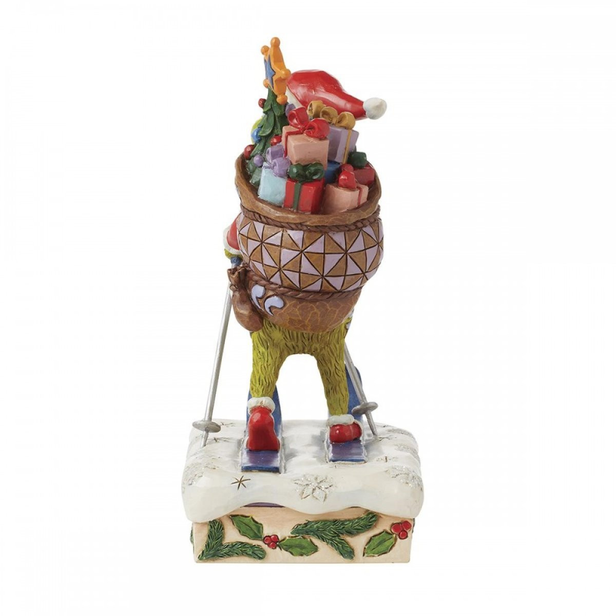 Esta figura muestra al Grinch esquiando por las montañas nevadas con una pesada bolsa de regalos y un árbol en la espalda. Vestido como Papá Noel, no va a entregar estos regalos, sino que simplemente los ha robado de las casas de todos los niños de Chouville. De la colección Grinch, diseñada por el galardonado artista y escultor Jim Shore. Cada figura está pintada a mano y se esperan ligeras variaciones de color, lo que hace que cada pieza sea única. Empaquetado en una caja de regalo. Estos artículos no son juguetes para niños. Destinado únicamente a adultos.
