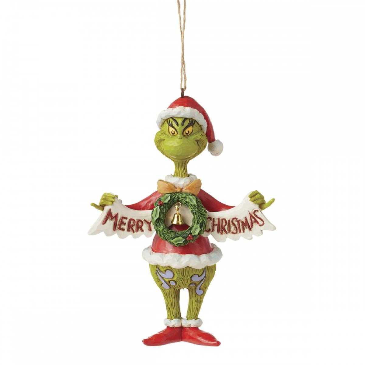 This Jim Shore pendant features the Grinch with a Merry Christmas banner and a Christmas wreath. With a bell around his neck, he wears a Santa suit and hat with a smile. Celebrate the season in style with this iconic Christmas character! From the Grinch Collection, designed by award-winning artist and sculptor Jim Shore. Each figurine is hand painted and slight color variations are expected, making each piece unique. Packaged in a gift box. These items are not children's toys. Intended for adults only.