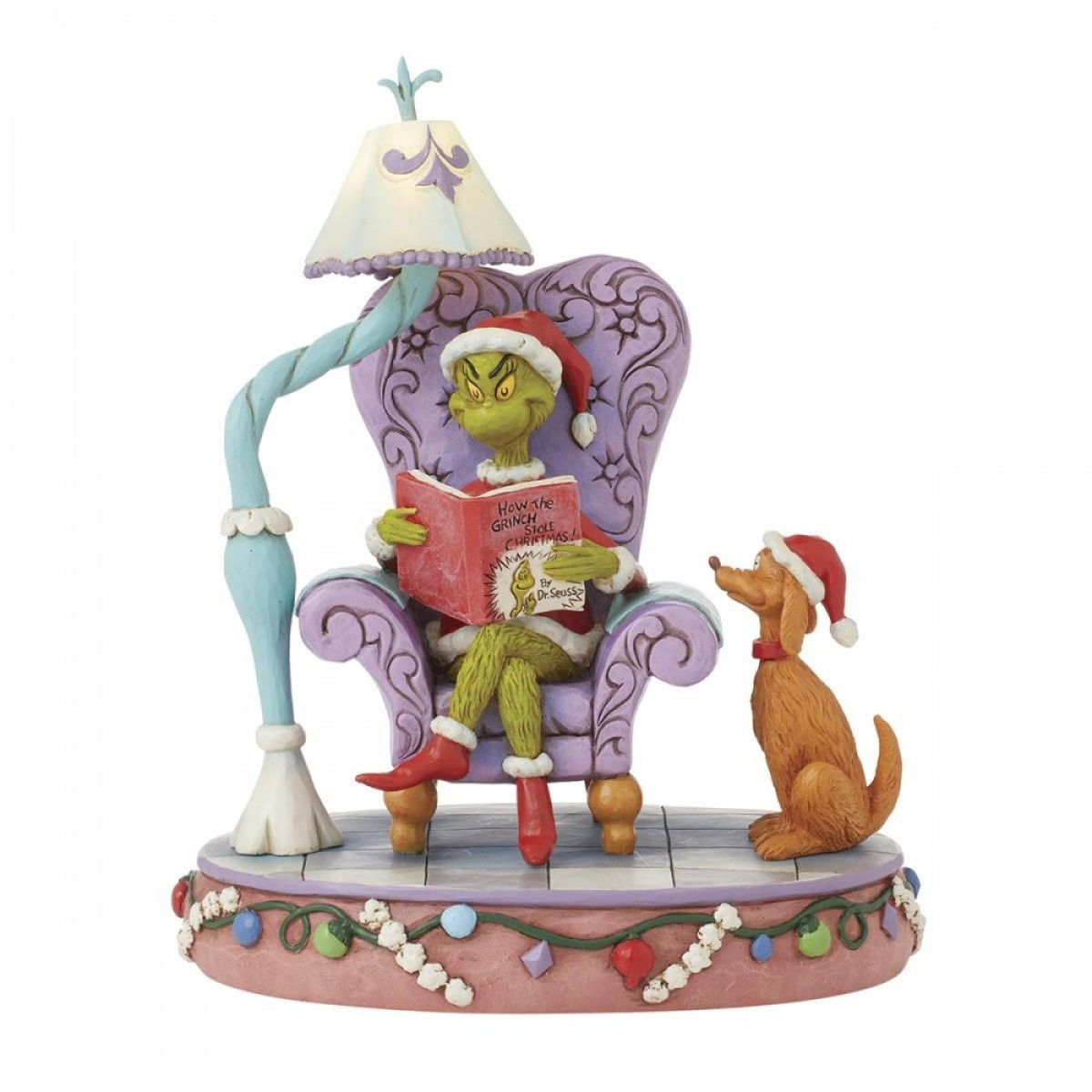Esta figura presenta al Grinch sentado cómodamente en un sillón azul y morado. El Grinch lee su libro vestido de Papá Noel. Su fiel perro, Max, se sienta a su lado. Si está demasiado oscuro, enciende su lámpara para que el Grinch pueda seguir leyendo. De la Colección Grinch, diseñada por el galardonado artista y escultor Jim Shore. Cada figura está pintada a mano y se esperan ligeras variaciones de color, lo que hace que cada pieza sea única. Empaquetado en una caja de regalo. Estos artículos no son juguetes para niños. Destinado solo para adultos.