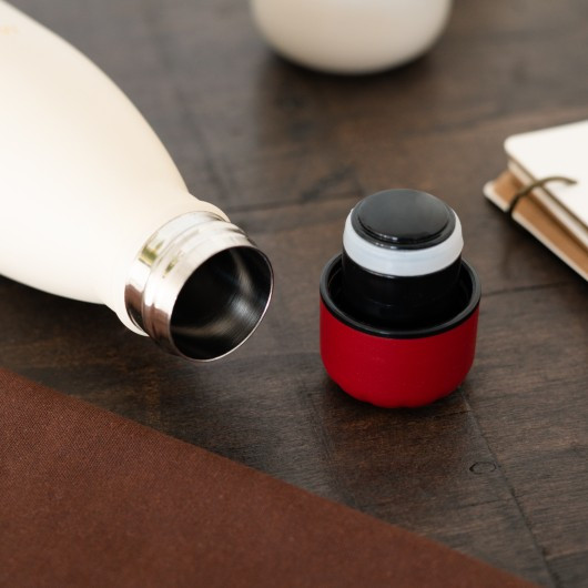 Botella de acero inoxidable de doble pared que mantiene tu bebida caliente durante 12 horas y fría durante 24 horas. Incluye tapón hermético.