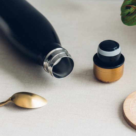 Botella de acero inoxidable de doble pared que mantiene tu bebida caliente durante 12 horas y fría durante 24 horas. Incluye tapón hermético.