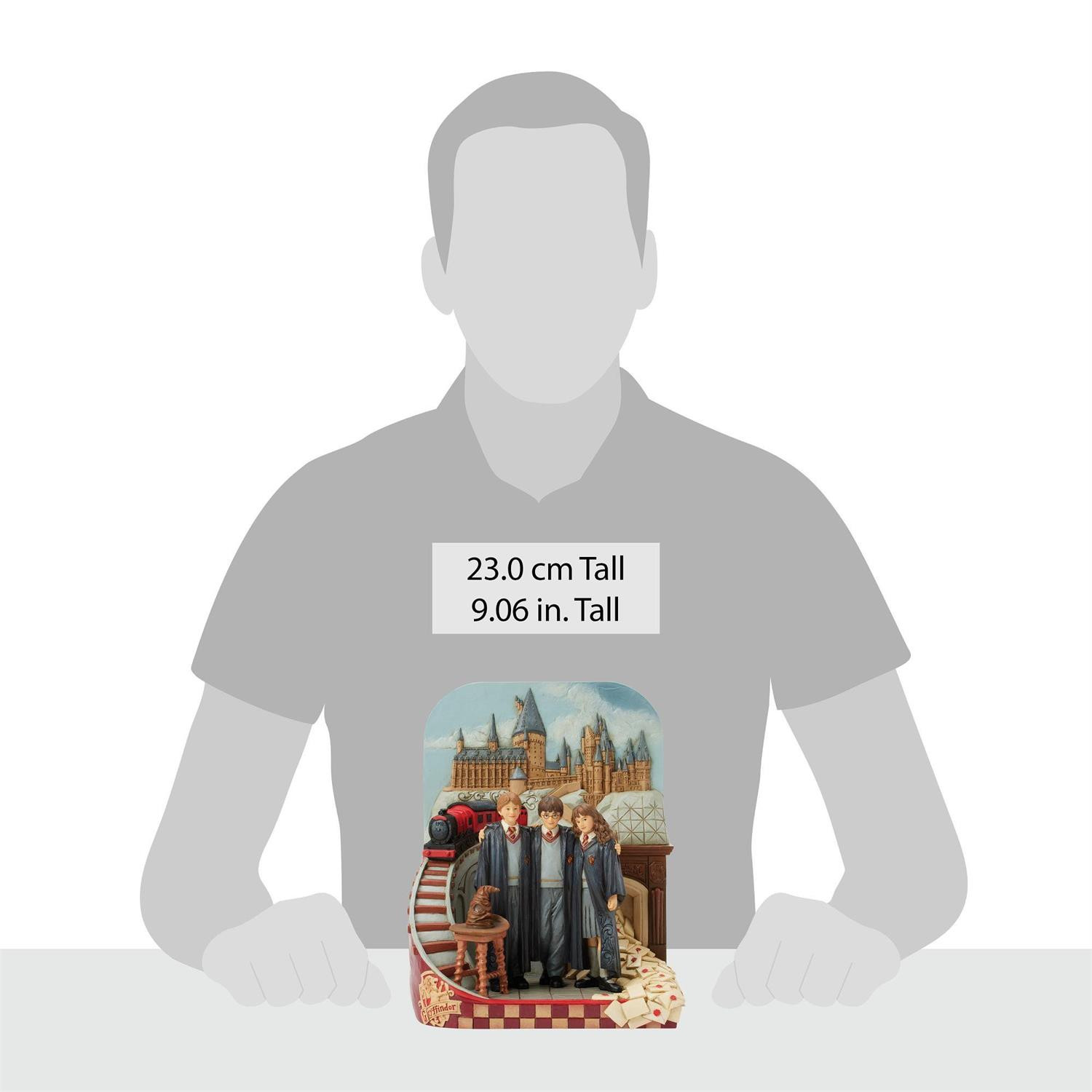 Esta encantadora escena de Jim Shore da vida a la magia de Hogwarts con Harry, Ron y Hermione de pie juntos con sus túnicas de Gryffindor fuera del icónico castillo. El diseño incluye el Expreso de Hogwarts, cartas voladoras y el Sombrero Seleccionador.