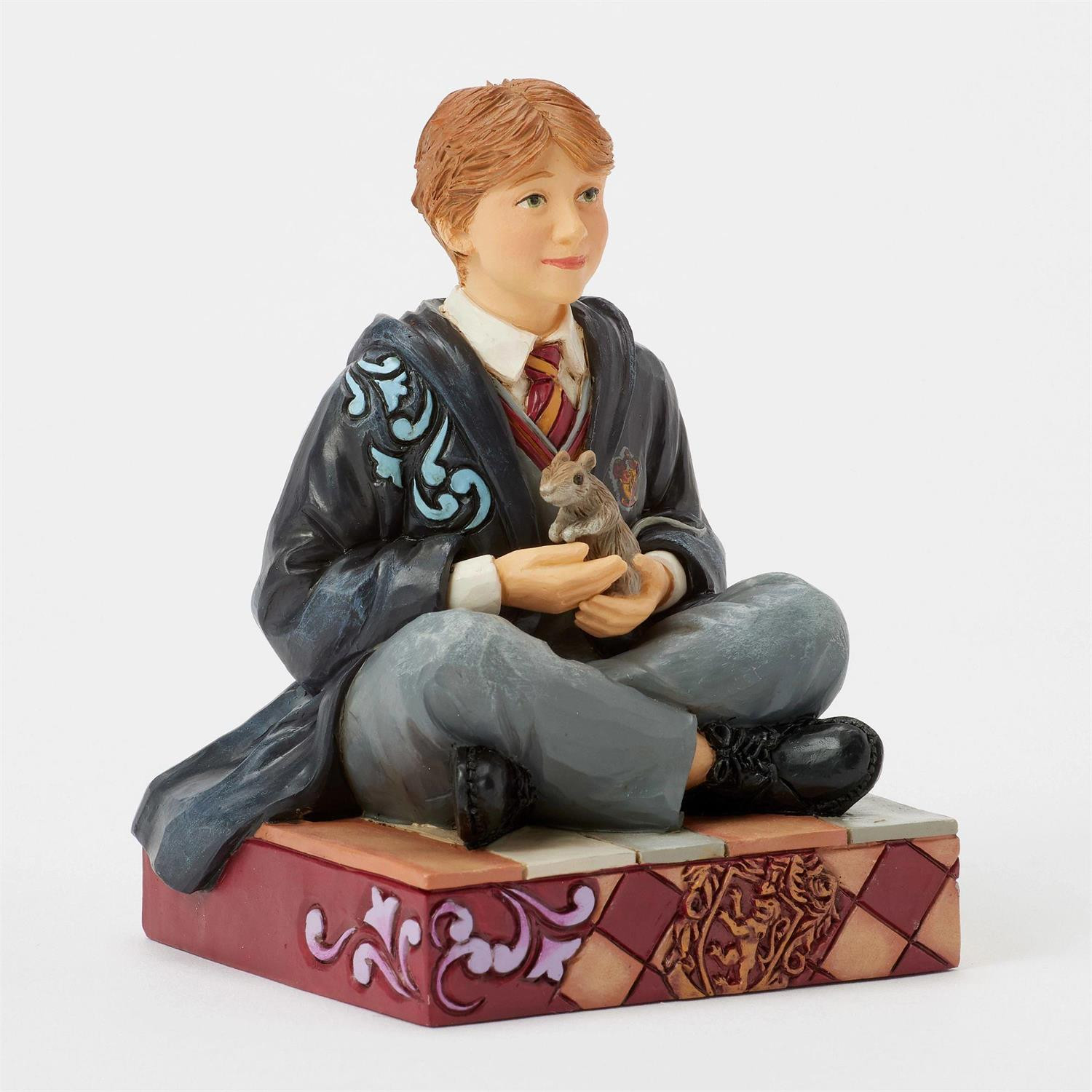 Esta encantadora efigie de Jim Shore representa a Ron Weasley sentado en el suelo con su vestido de Gryffindor, sosteniendo a Rata Enranjada en sus manos. Con detalles de arte popular intrincados y colores cálidos, la pieza captura la personalidad y lealtad entrañables de Ron.