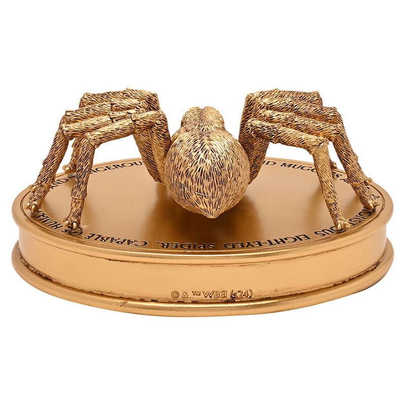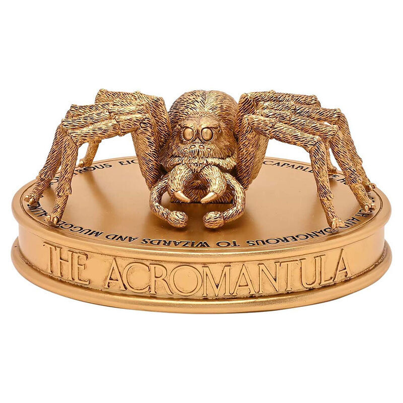- Con detalles intrincados y un acabado en tono dorado, esta figura de Aragog se asienta sobre una base con la inscripción "La Acromántula".